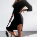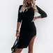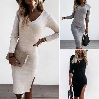 Fashion Solid Color Long Sleeve V-neck Slit Hem Slim Fit Dress