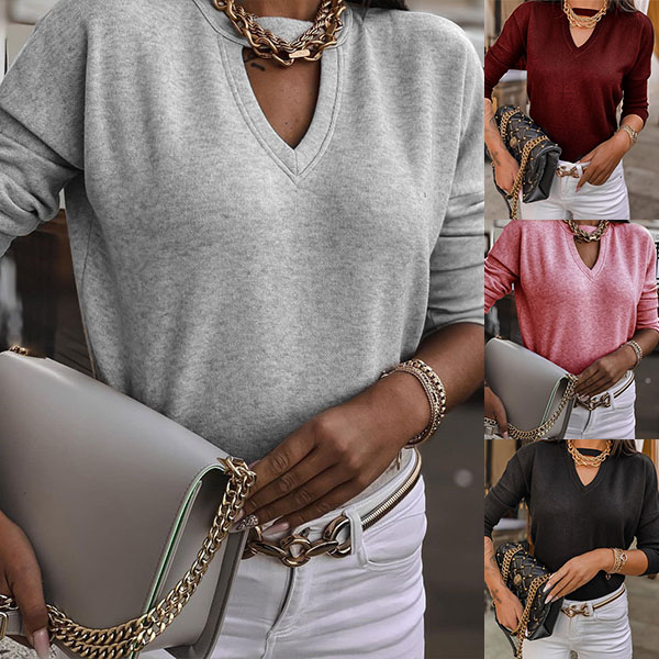 Fashion Solid Color Long Sleeve V-neck T-shirt