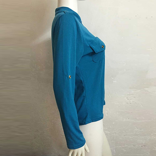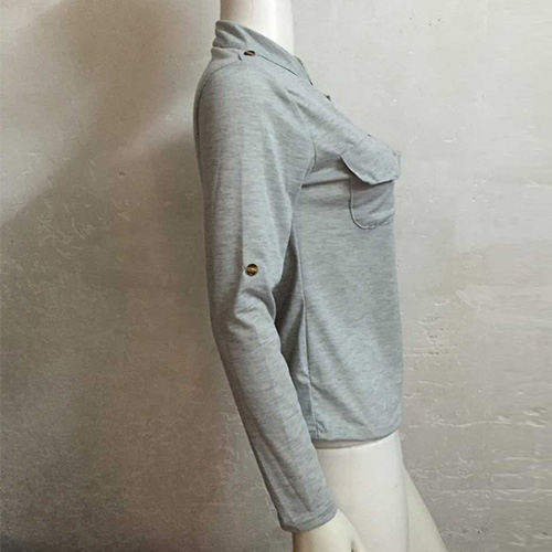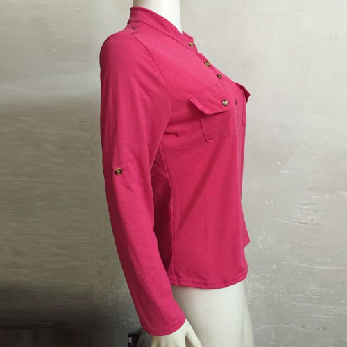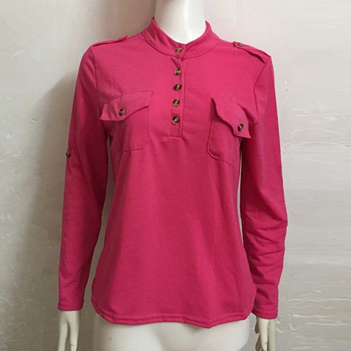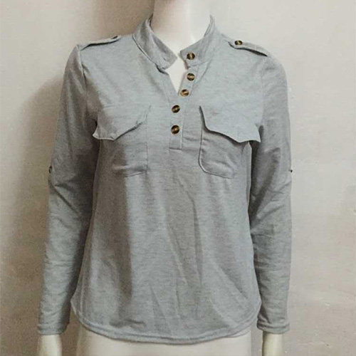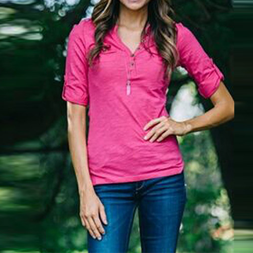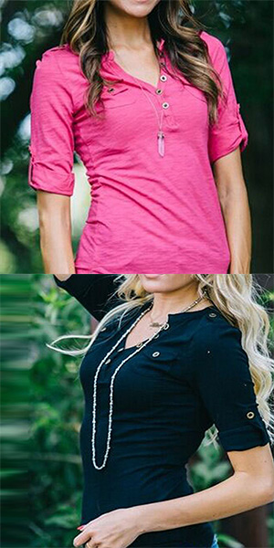 This t-shirt features solid color style,with long sleeve and v-neck design,neckline decorated with buttons,