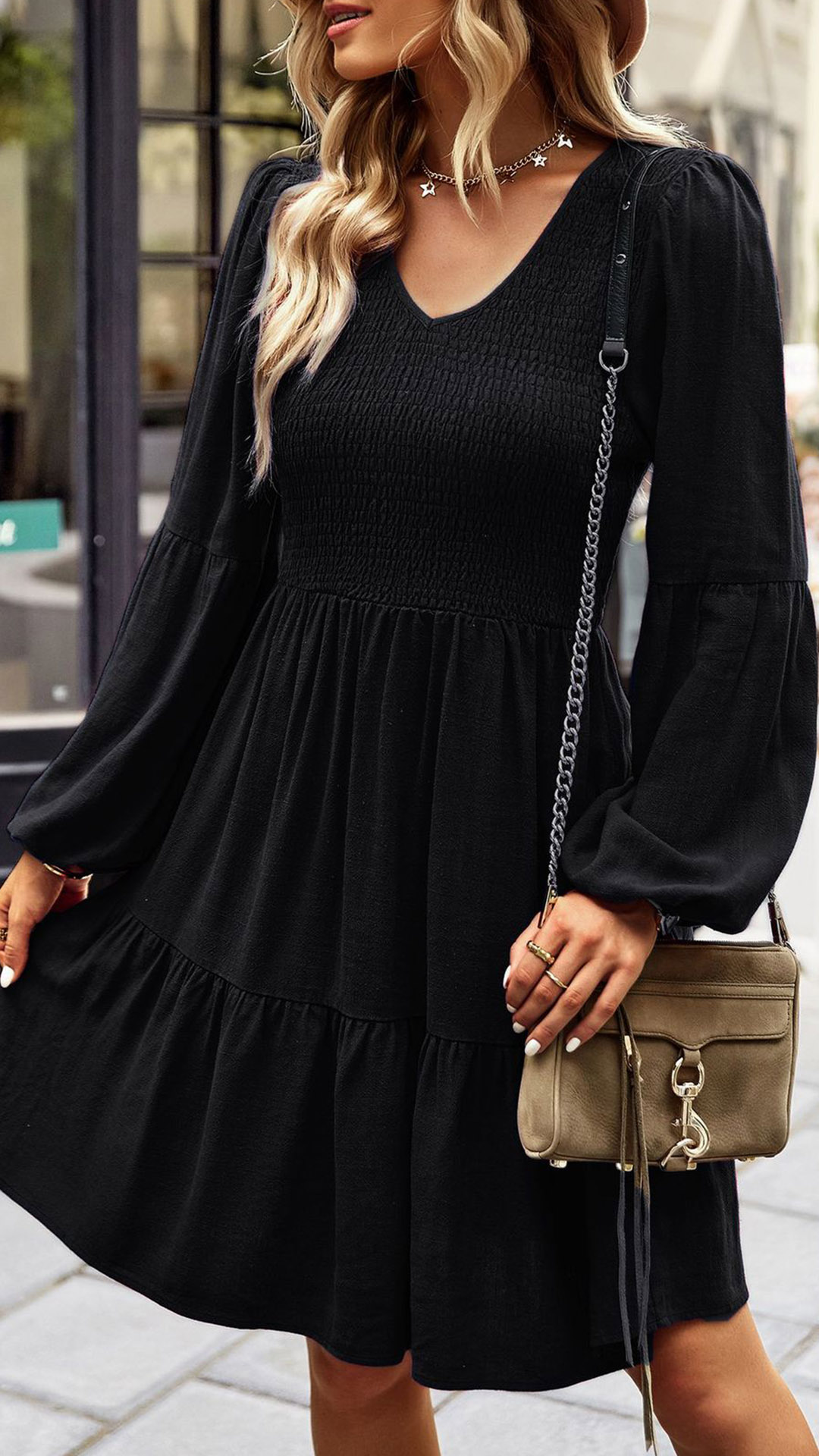How about this dress? The solid color is versatile and can be dressed up or down, while the V-neck and tiered skirt add a touch of glamour. Wanna have a try?