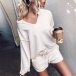 Fashion Solid Color Long Sleeve V-neck Top + Shorts Two-piece Set