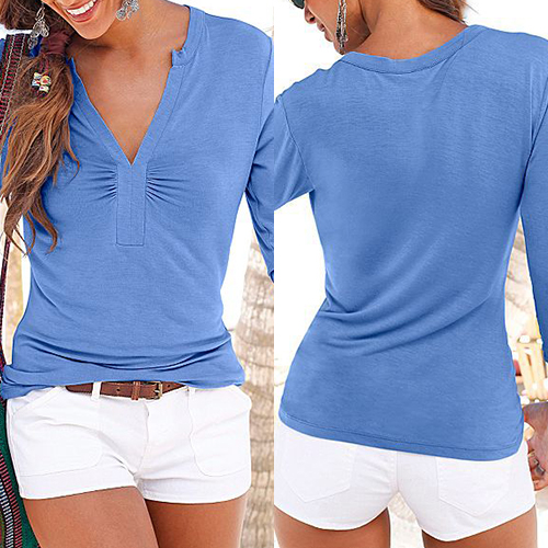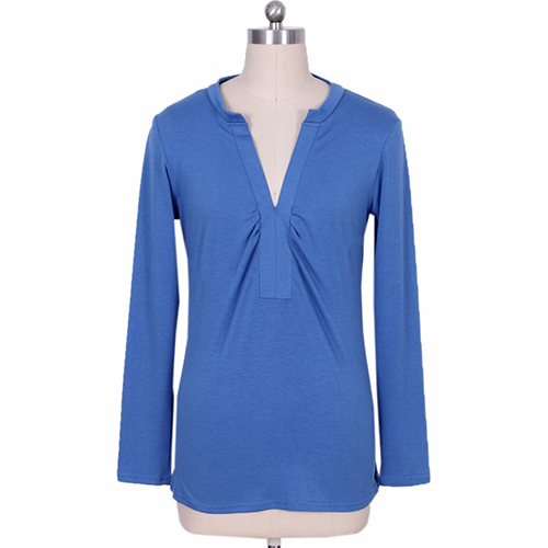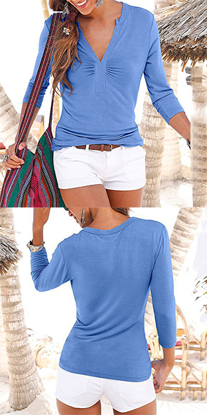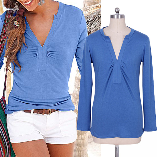 This t-shirt is pure blue and it is designed with long sleeves and a notched neckline, which makes it simple but fashion. Moreover,