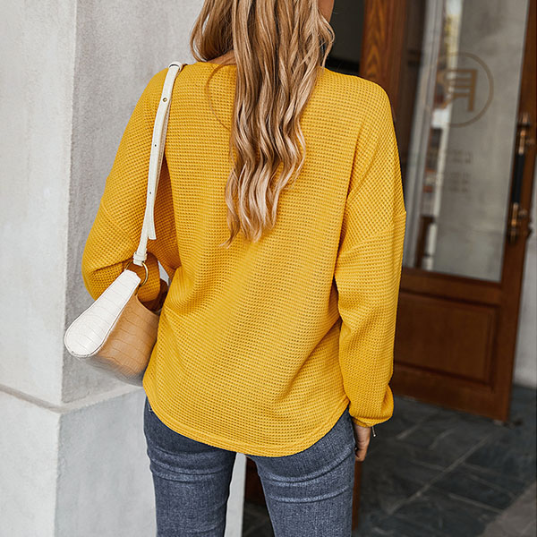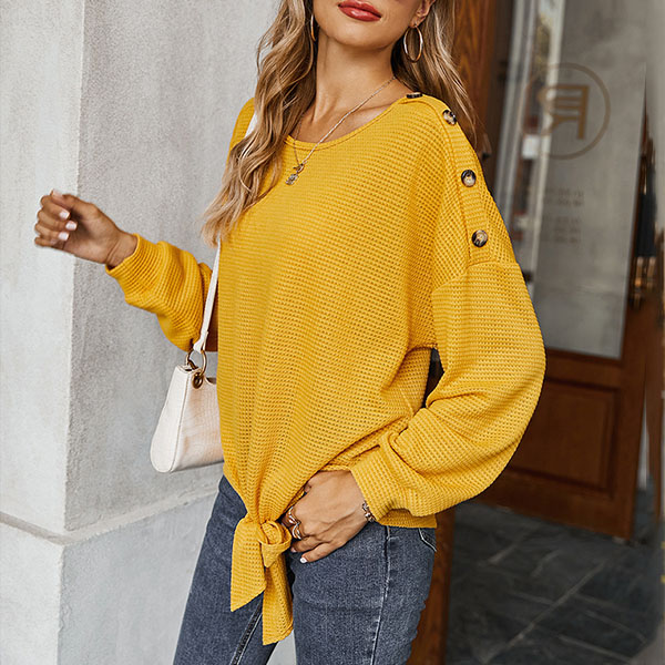For your early autumn days,this long sleeve knit top can easily strike your mind. Solid color style,its soft and cozy knitted fabric can give you a long-lasting comfort,while the knotted hem design will make this piece look more attractive. You can add a necklace if you wanna look more charming!