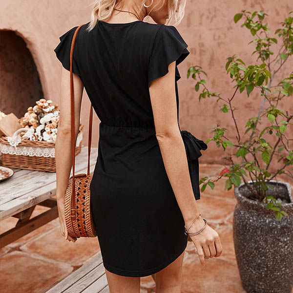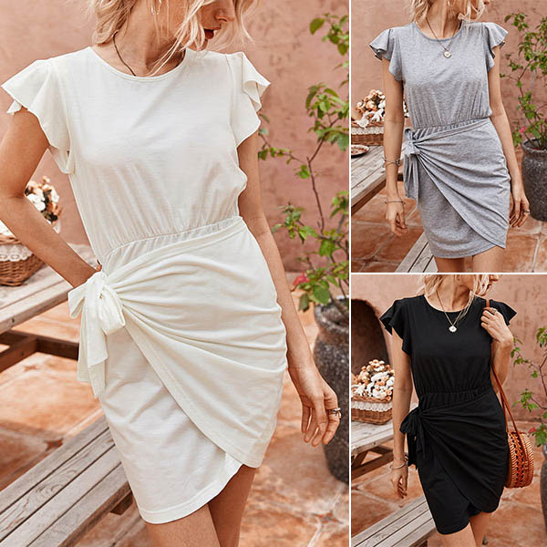 Fashion Solid Color Lotus Sleeve Lace-up Dress