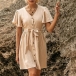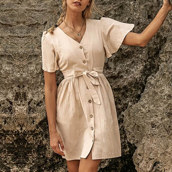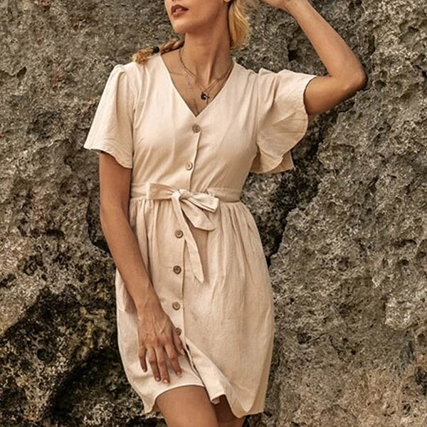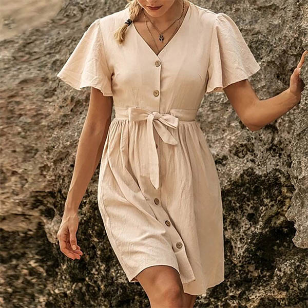 When you have no idea about what to wear for your daily out,then you can make your eyes focused on this dress. Solid color style,the lotus sleeve,v-neck and single-breasted design can easily enhance the charm of this dress. Just need to match with your favourite heels,then you can look fashionable enough!