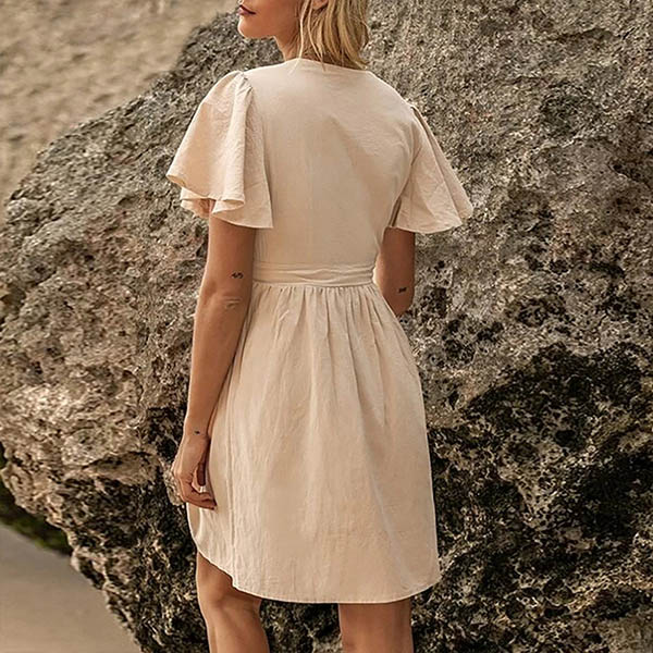 Fashion Solid Color Lotus Sleeve V-neck High Waist Dress