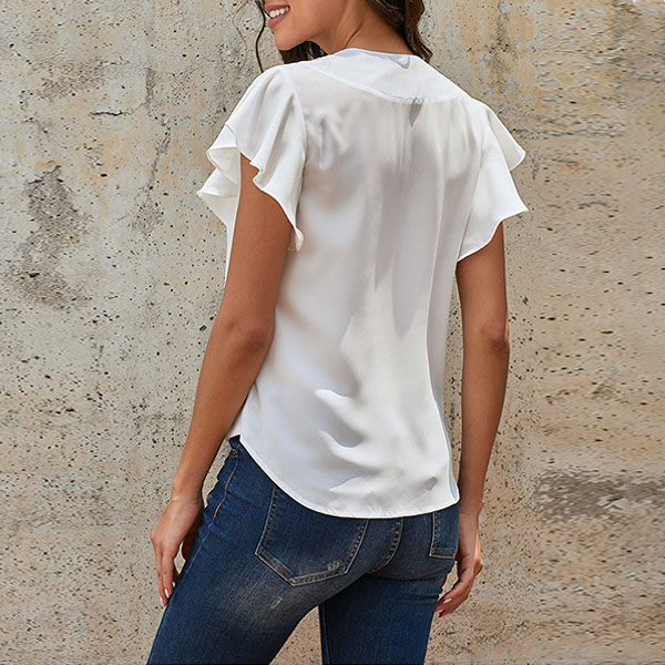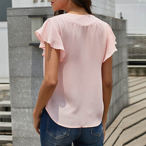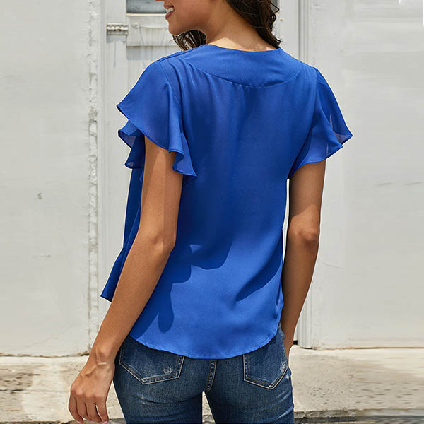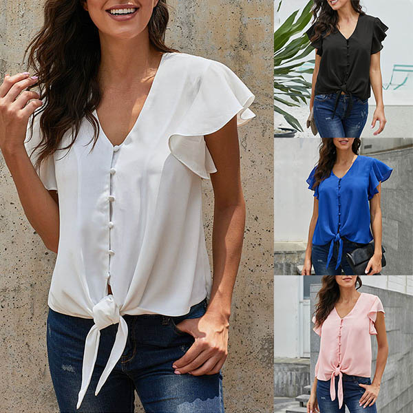Fashion Solid Color Lotus Sleeve V-neck Knotted Hem Blouse