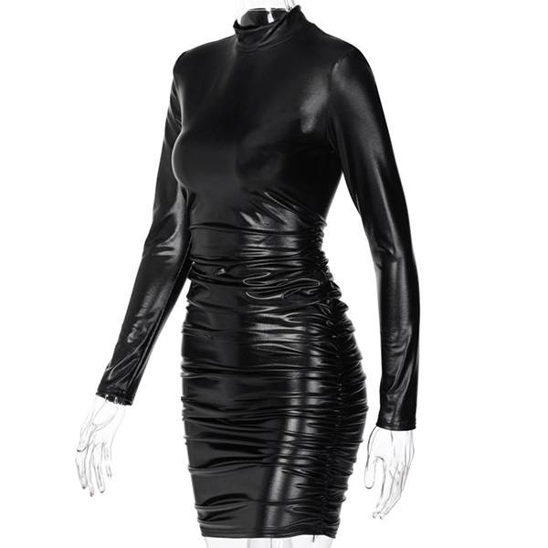 Fashion Solid Color Mock Neck Long Sleeve Ruched Artificial Leather PU Dress