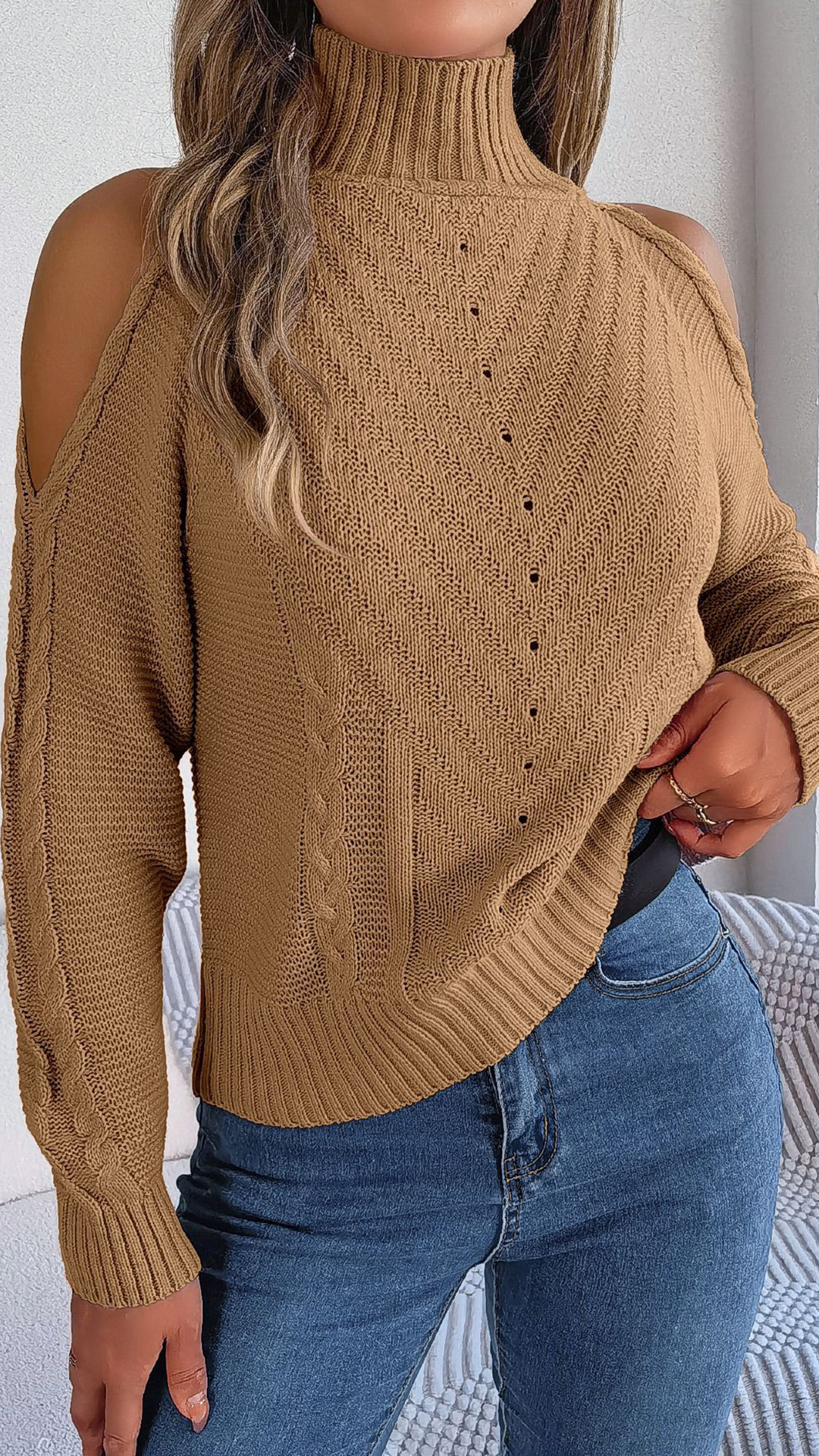 This sweater is the perfect blend of style and sophistication. Made from high-quality knitted fabric, it offers a soft and cozy feel. The mock neck design adds a touch of elegance and warmth, while the open shoulder detail adds a trendy and fashionable element. Pair it with jeans and ankle boots for a chic and effortless look。