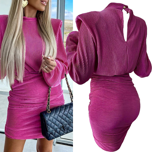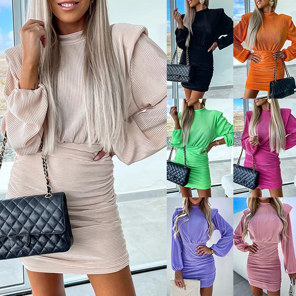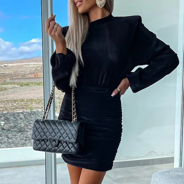 How about this dress? The mock neck adds a touch of sophistication, while the puff long sleeves provide a chic and fashionable look. The ruched detailing on the bodycon silhouette adds texture and visual interest, creating a flattering and confident fit. Multi-colors avaible.