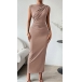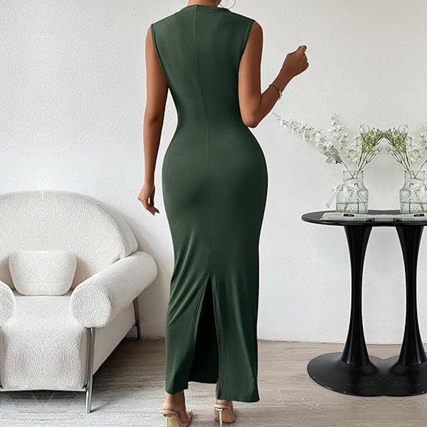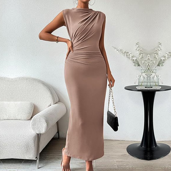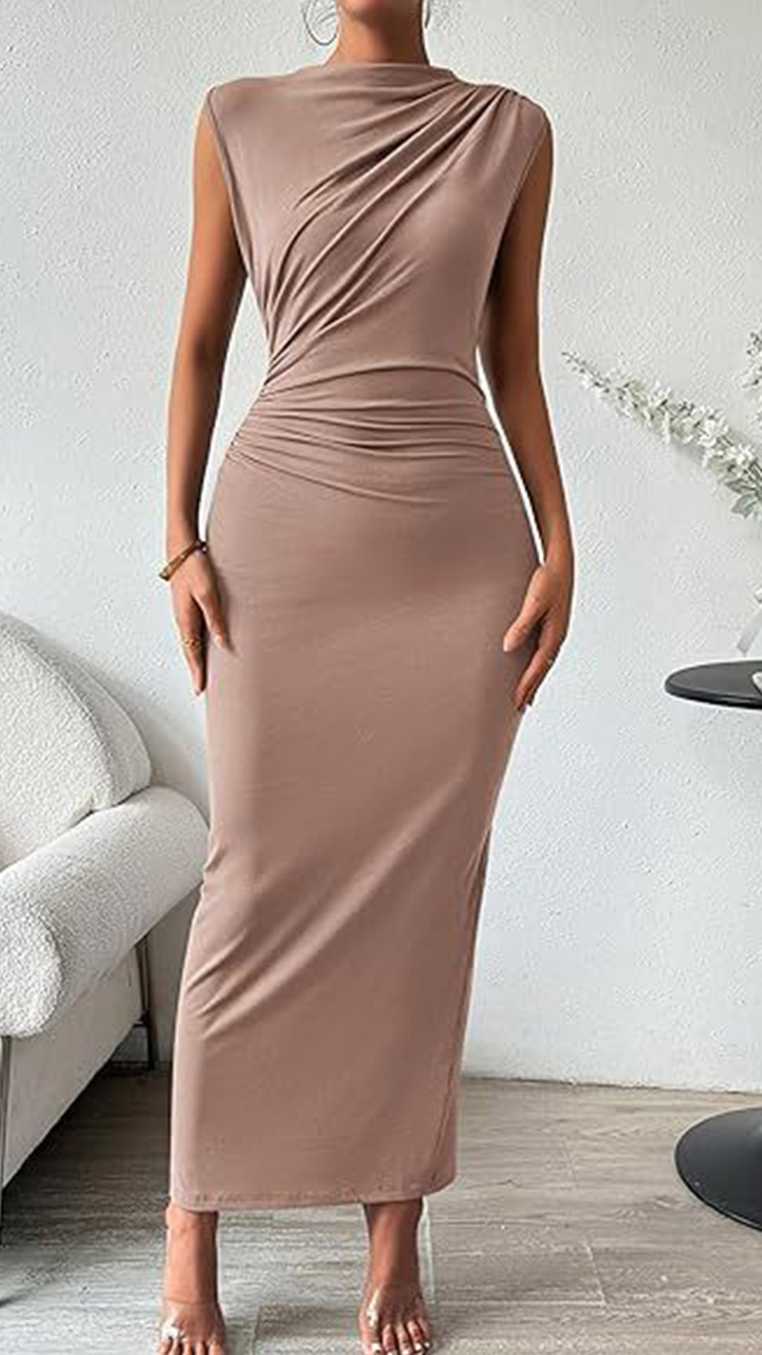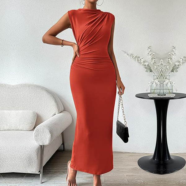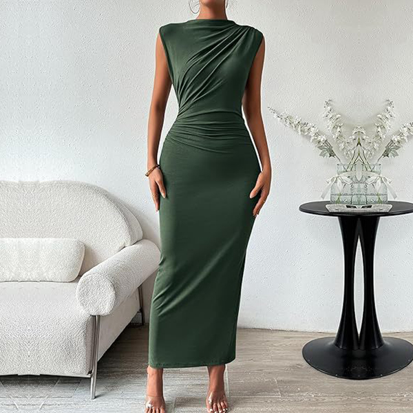 How about this midi dress? It features a solid color design, a mock neck, sleeveless silhouette, and ruched detailing for a chic and figure-flattering look.