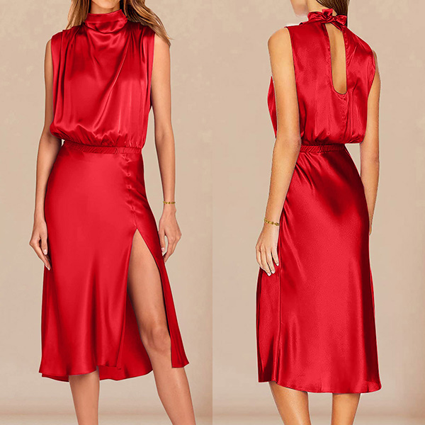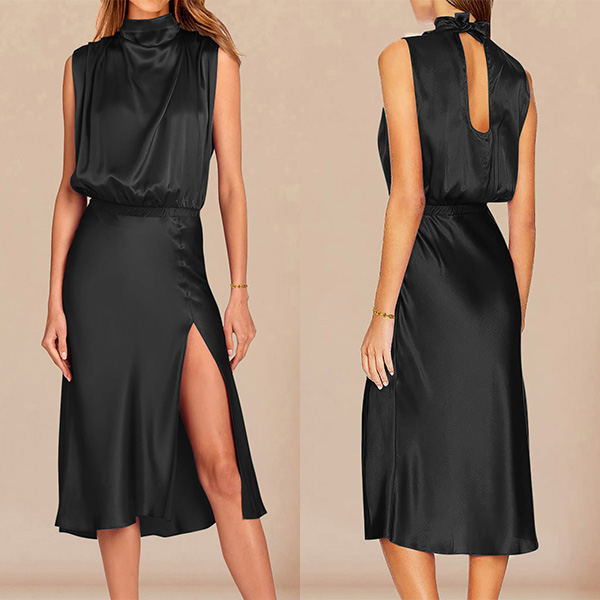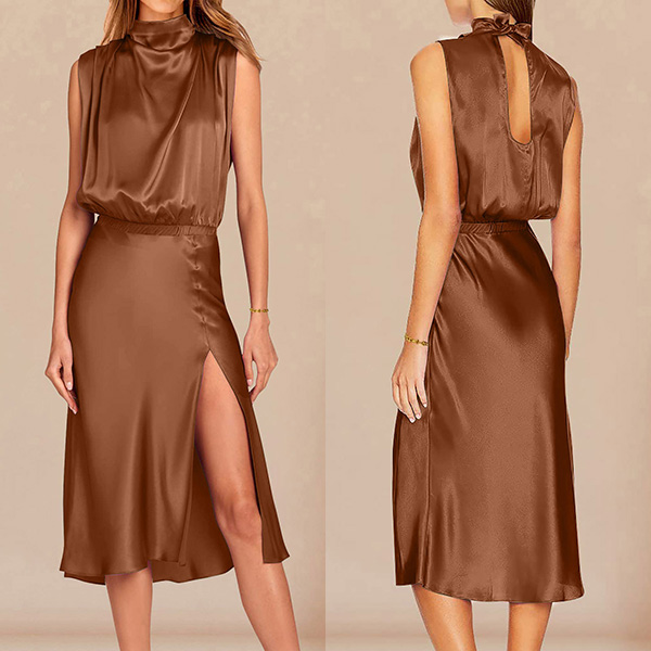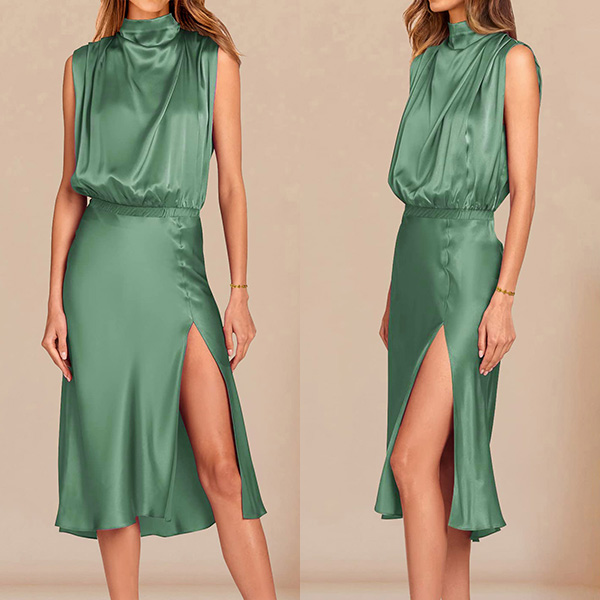 Fashion Solid Color Mock Neck Sleeveless Slit Satin Dress