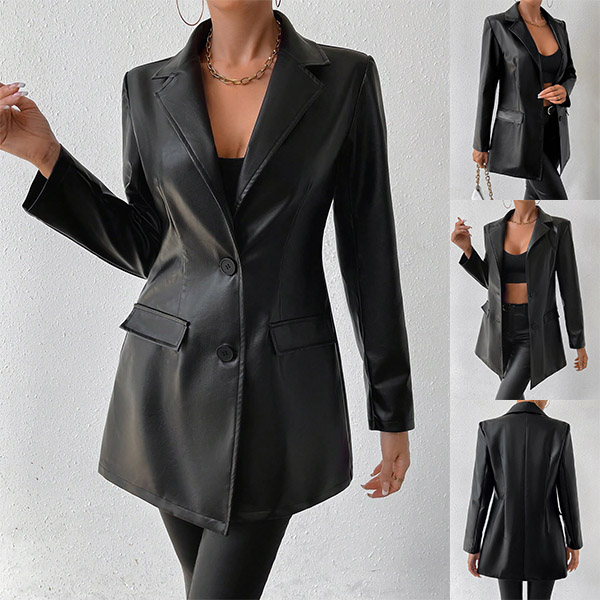 This is a stylish and edgy jacket that combines a solid color design, notch lapel, long sleeves, and artificial leather material for a fashionable and contemporary look.