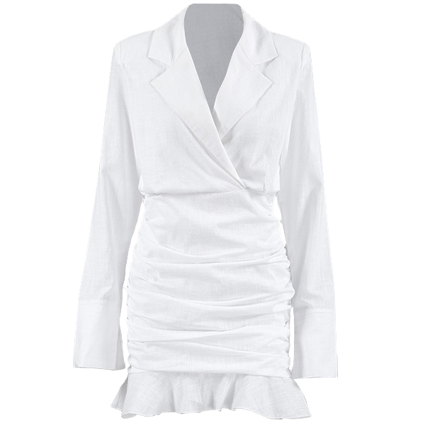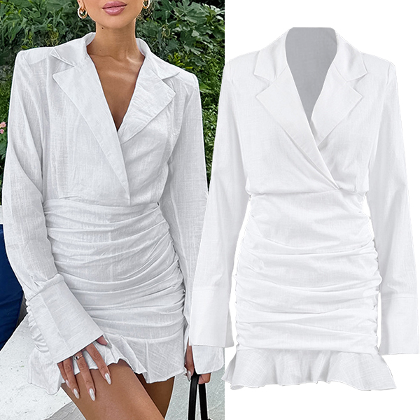 This white dress featurs notch lapel collar, long sleeves, ruffle hemline detail, and a classic white color for a sophisticated and timeless look. Wanna have a try?