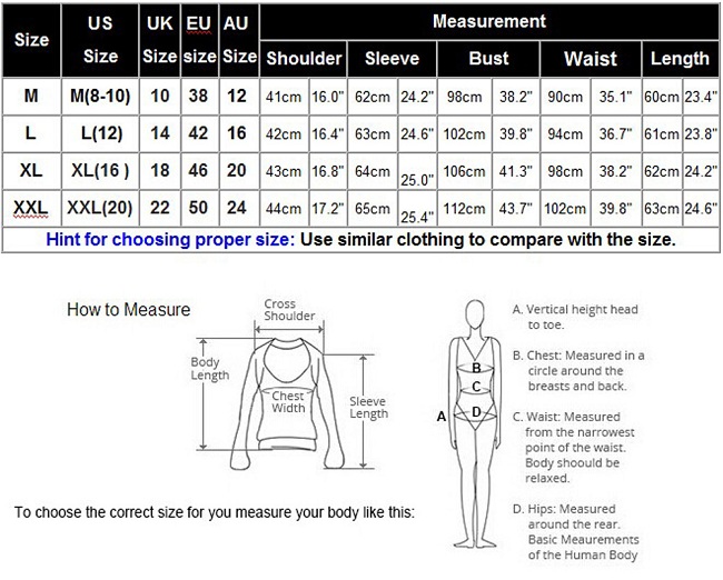 XXL: Bust: 112cm(43.7"); Waist: 102cm(39.8"); Shoulder: 44cm(17.2"); Sleeve: 65cm(25.4"); Length: 63cm(24.6");