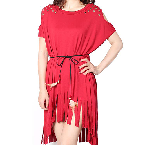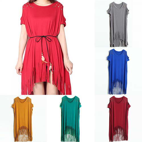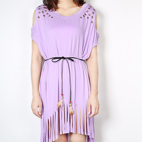 round neck and a loose silhouette,simple and cozy. And its off-shoulder and irregular tassel hem design