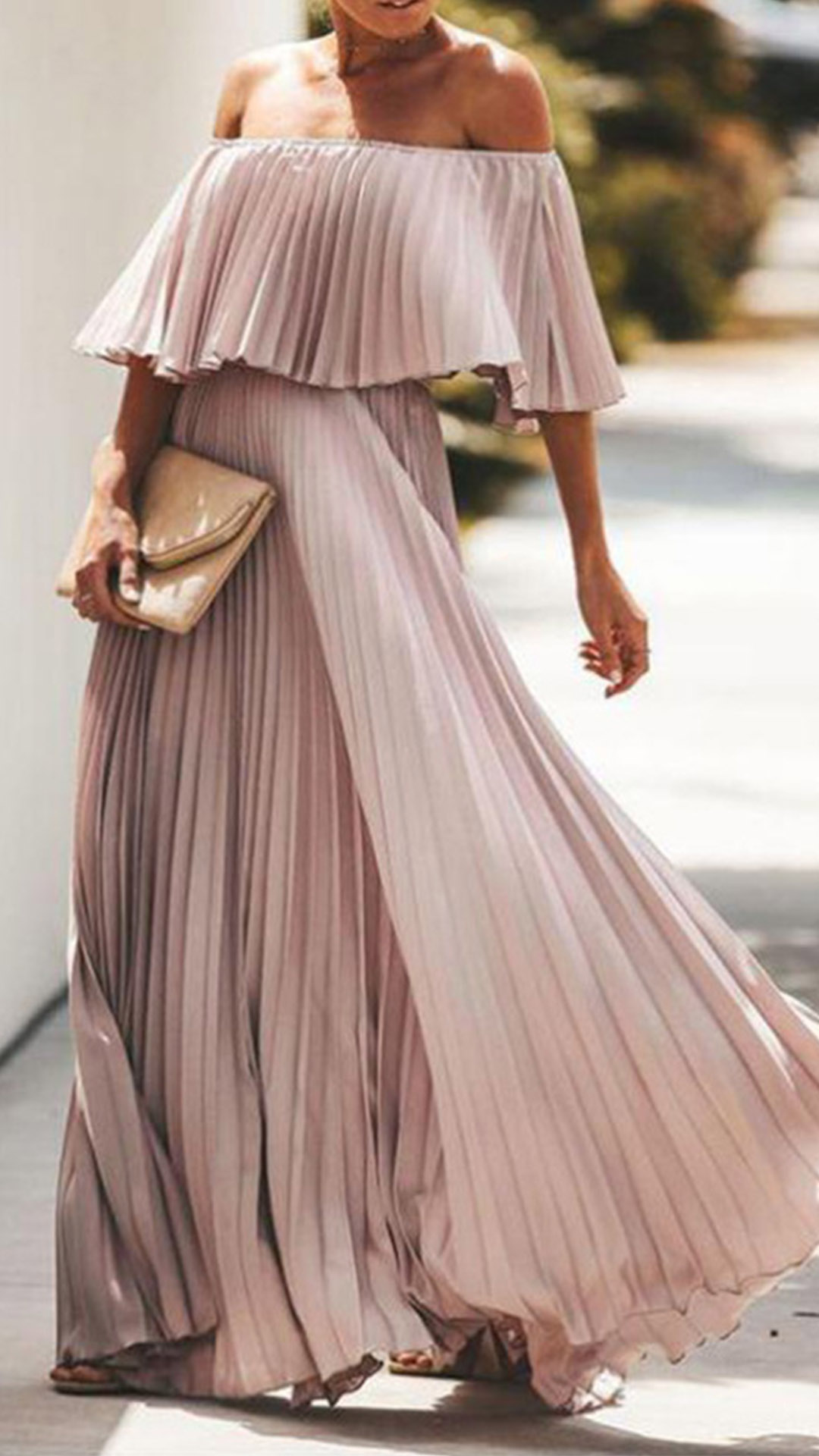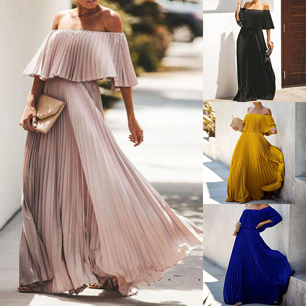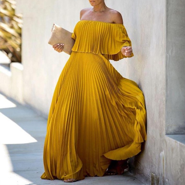 Fashion Solid Color Off-the-shoulder Ruffled Pleated Maxi Dress