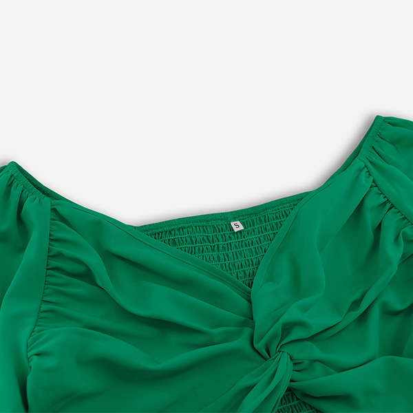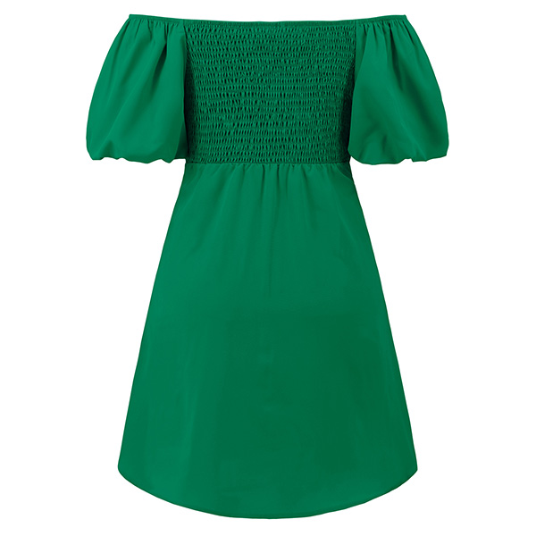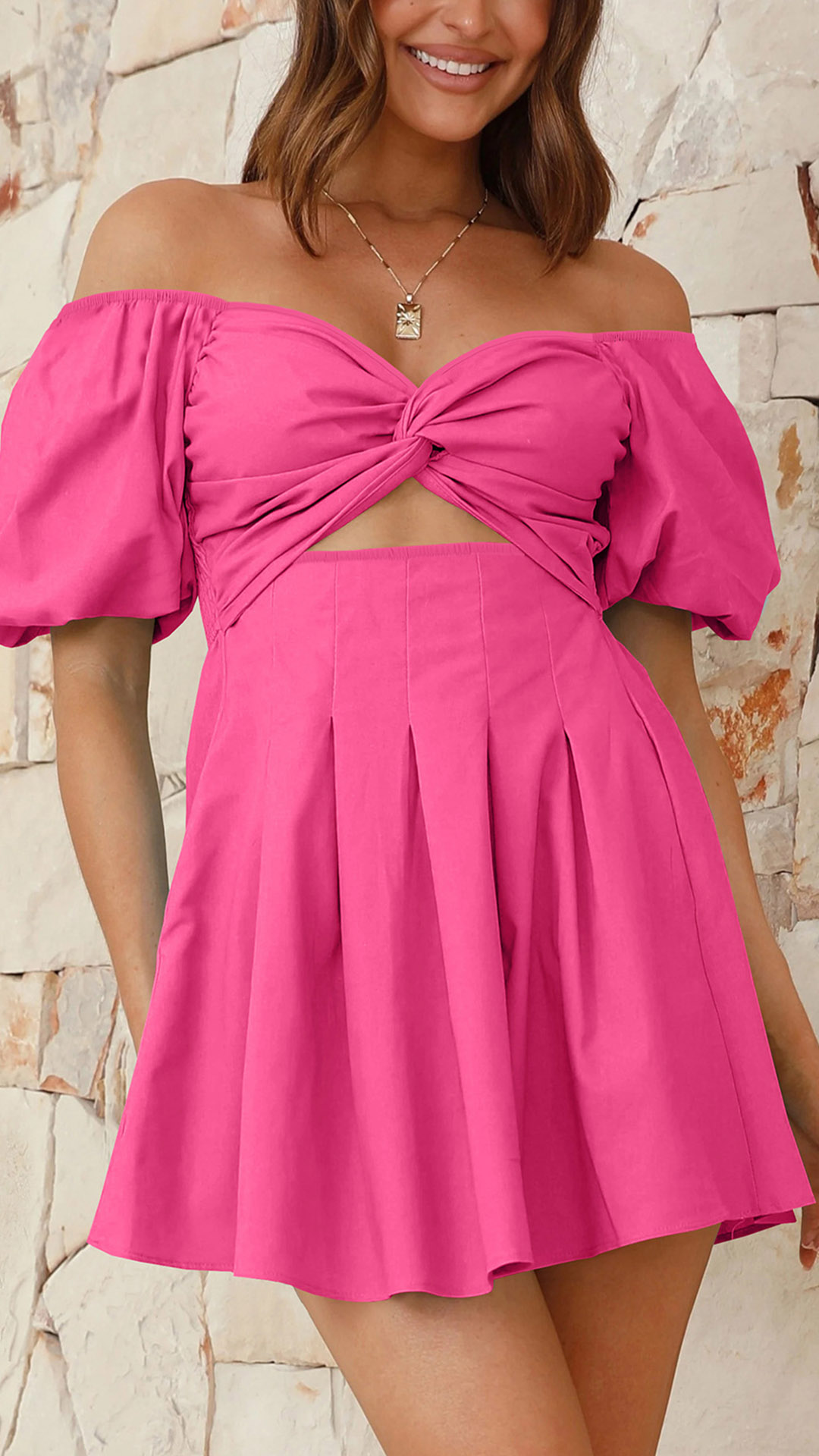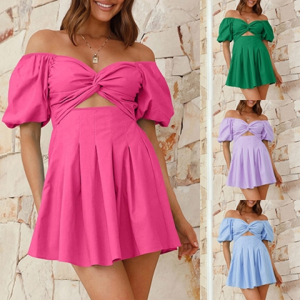This dress showcases a trendy off-the-shoulder neckline, short sleeves, and a stylish front cutout detail. Its solid color design adds a touch of sophistication to a playful and flirty silhouette. Multi-colors avabile.
