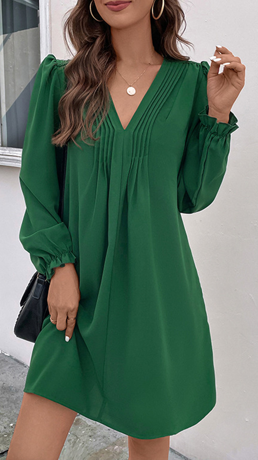 Featuring a pleated V-neck design, this dress adds texture and visual interest to your outfit. Wanna have a try?