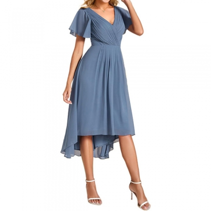 Fashion Solid Color Pleated V-neck Short Sleeve Irregular Hemline Chiffon Dress