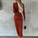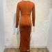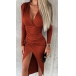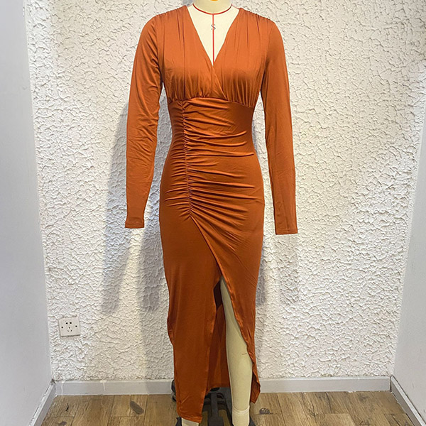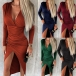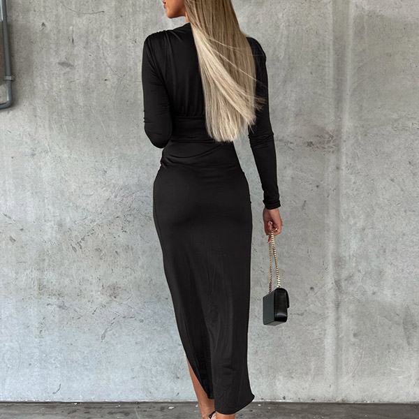 Fashion Solid Color Plunge V-neck Long Sleeve Irregular Hemline Ruched Bodycon Dress