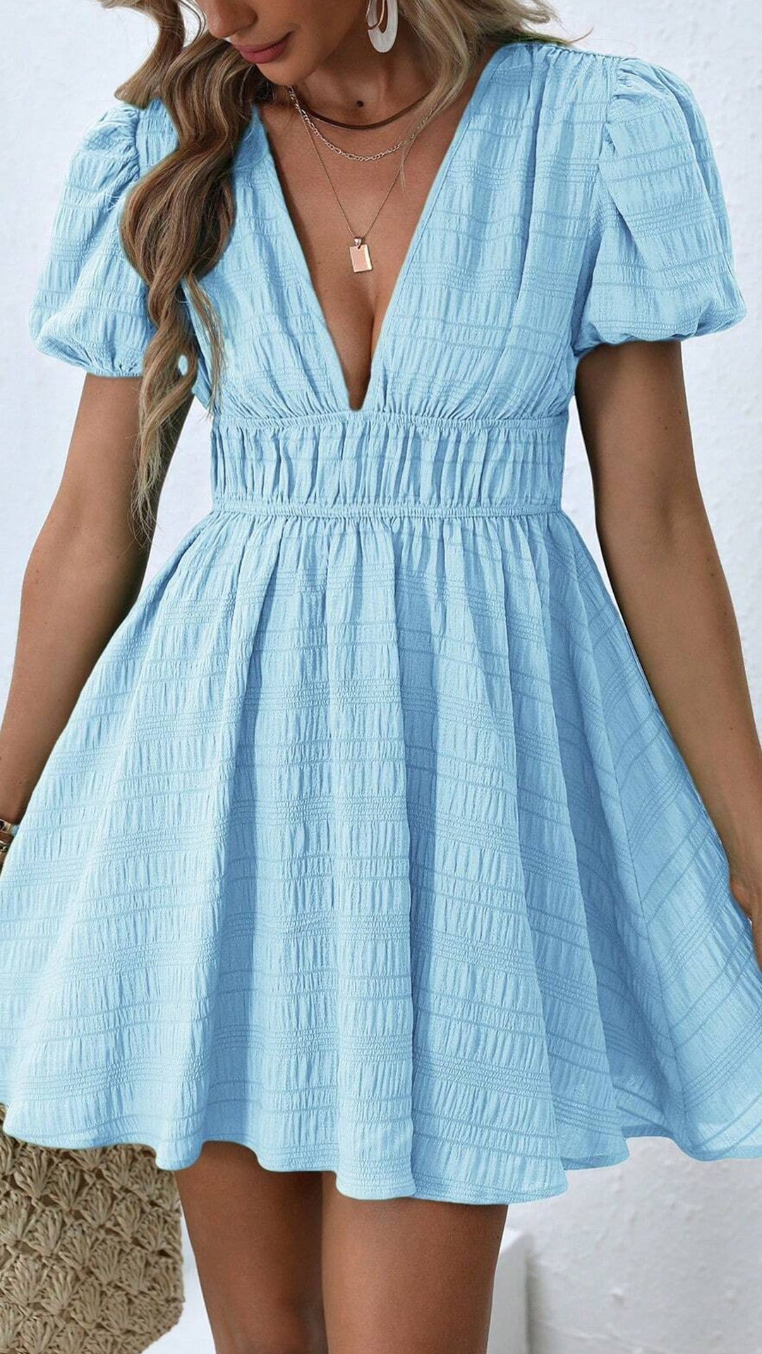 This chic dress features a bold plunging v-neckline, short sleeves, and a high-rise, mini-length silhouette, creating a sleek and alluring look. Multi-colors available.