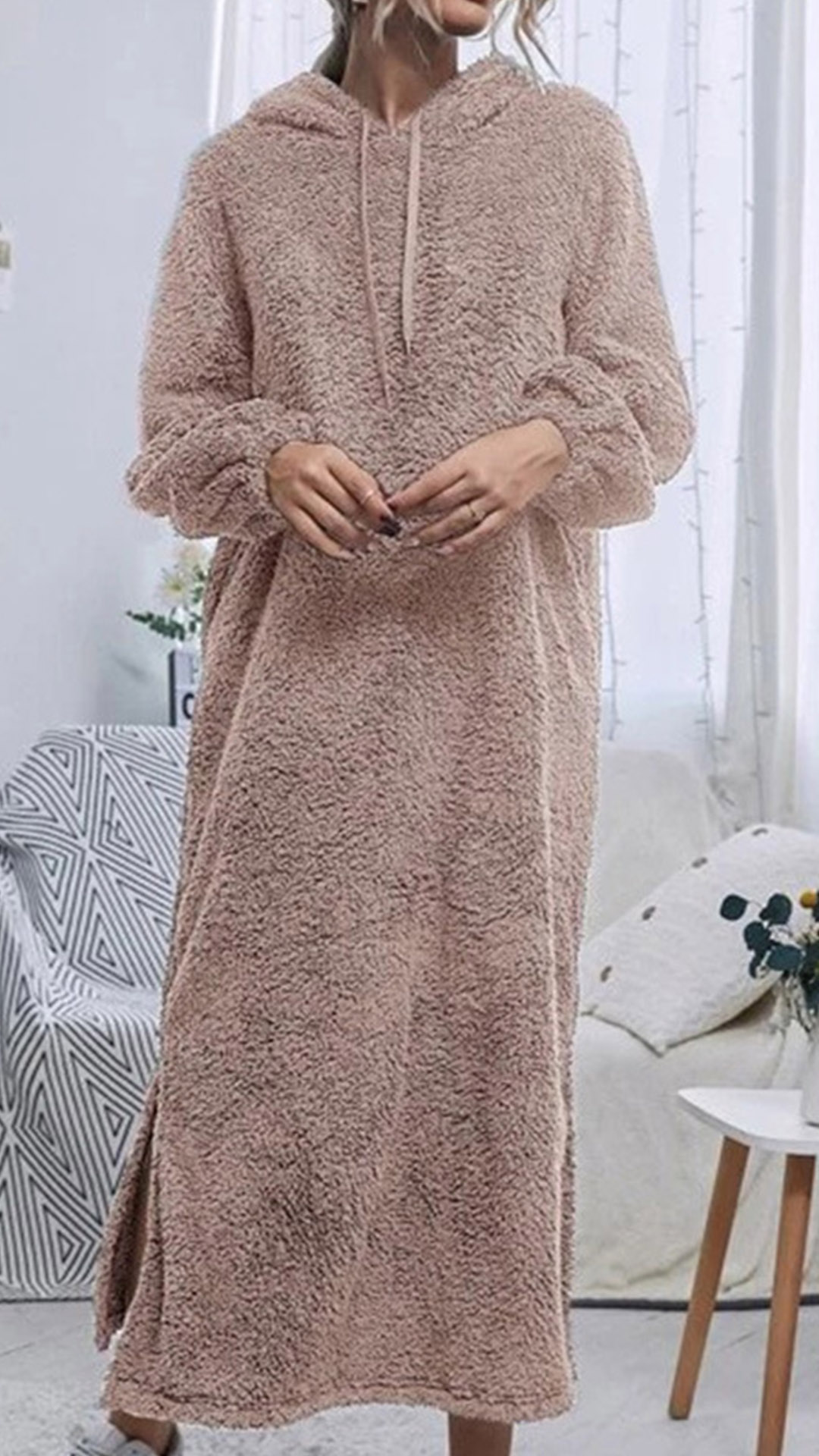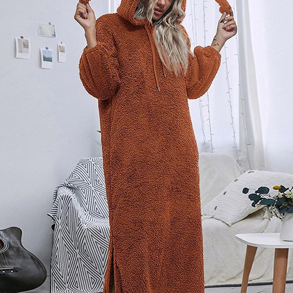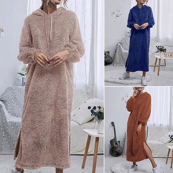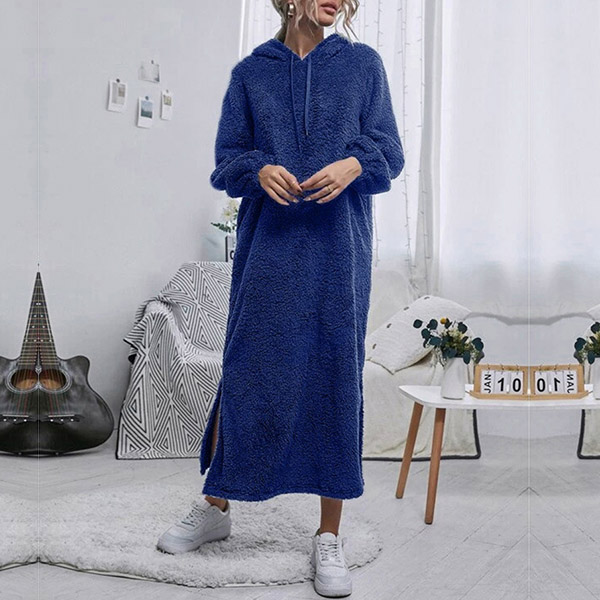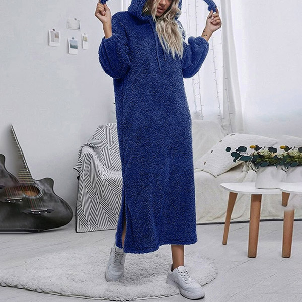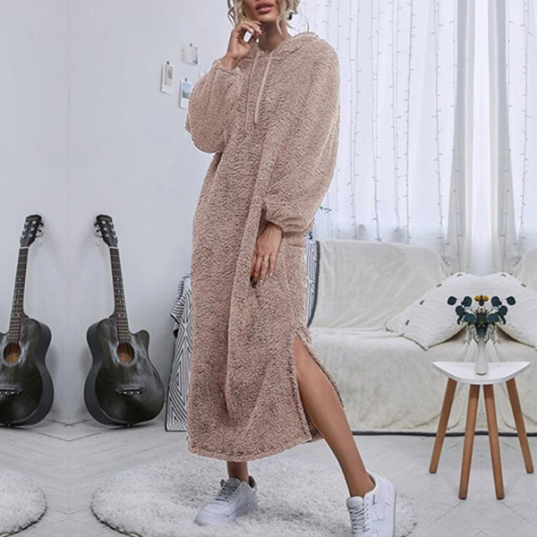 Fashion Solid Color Plush Slit Hooded Pajamas Dress