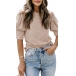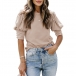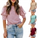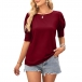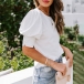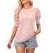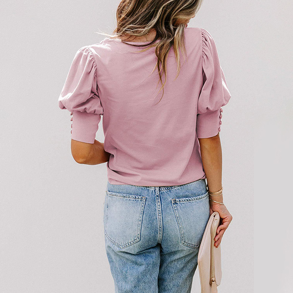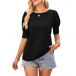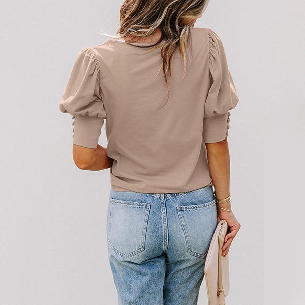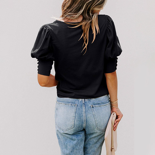 This chic and on-trend shirt features a solid color, puff short sleeves, and a classic round neck design. For a more casual look, the shirt can be paired with a pair of high-waisted jeans, a leather belt, and a pair of loafers or sneakers.