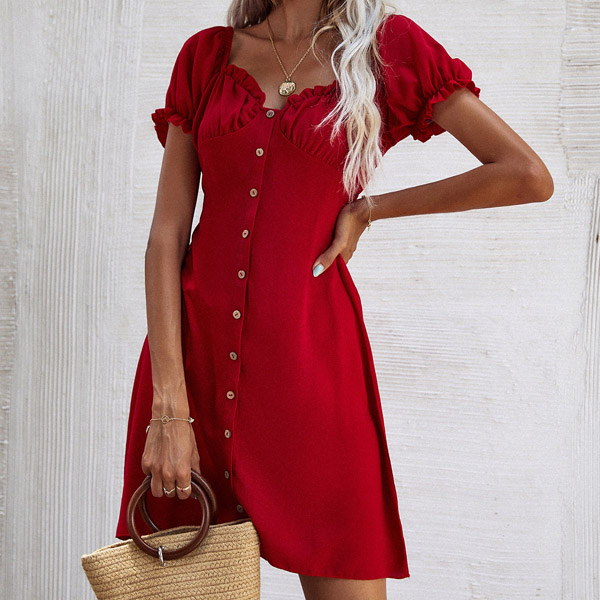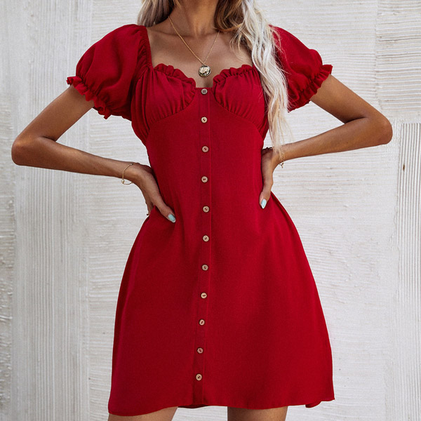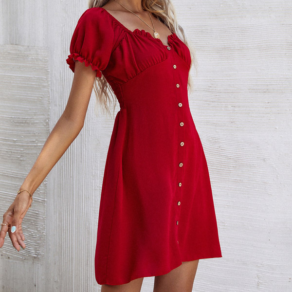 Fashion Solid Color Puff Sleeve Square Collar Front-button Solid Color Dress
