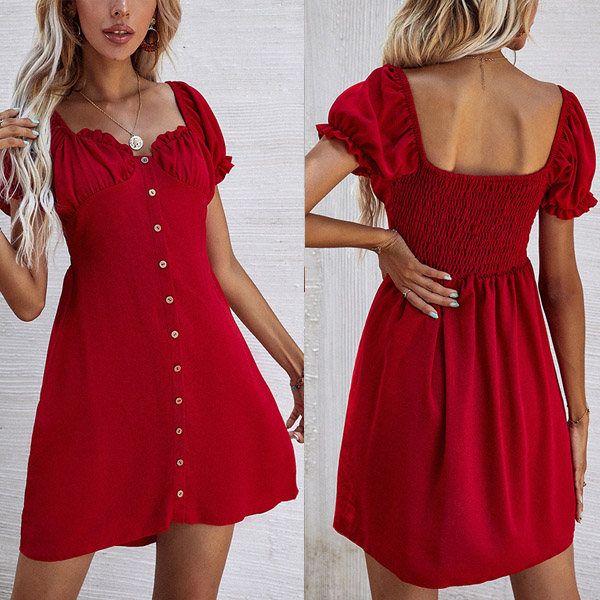When it comes to instant style definition,you can rest easy when you have this dress in your wardrobe. Comes with a bright and eye-catching red tone,finished with puff sleeve,square collar and front-button details,this dress definitely knows how to give yu a cozy yet stylish daily style.