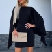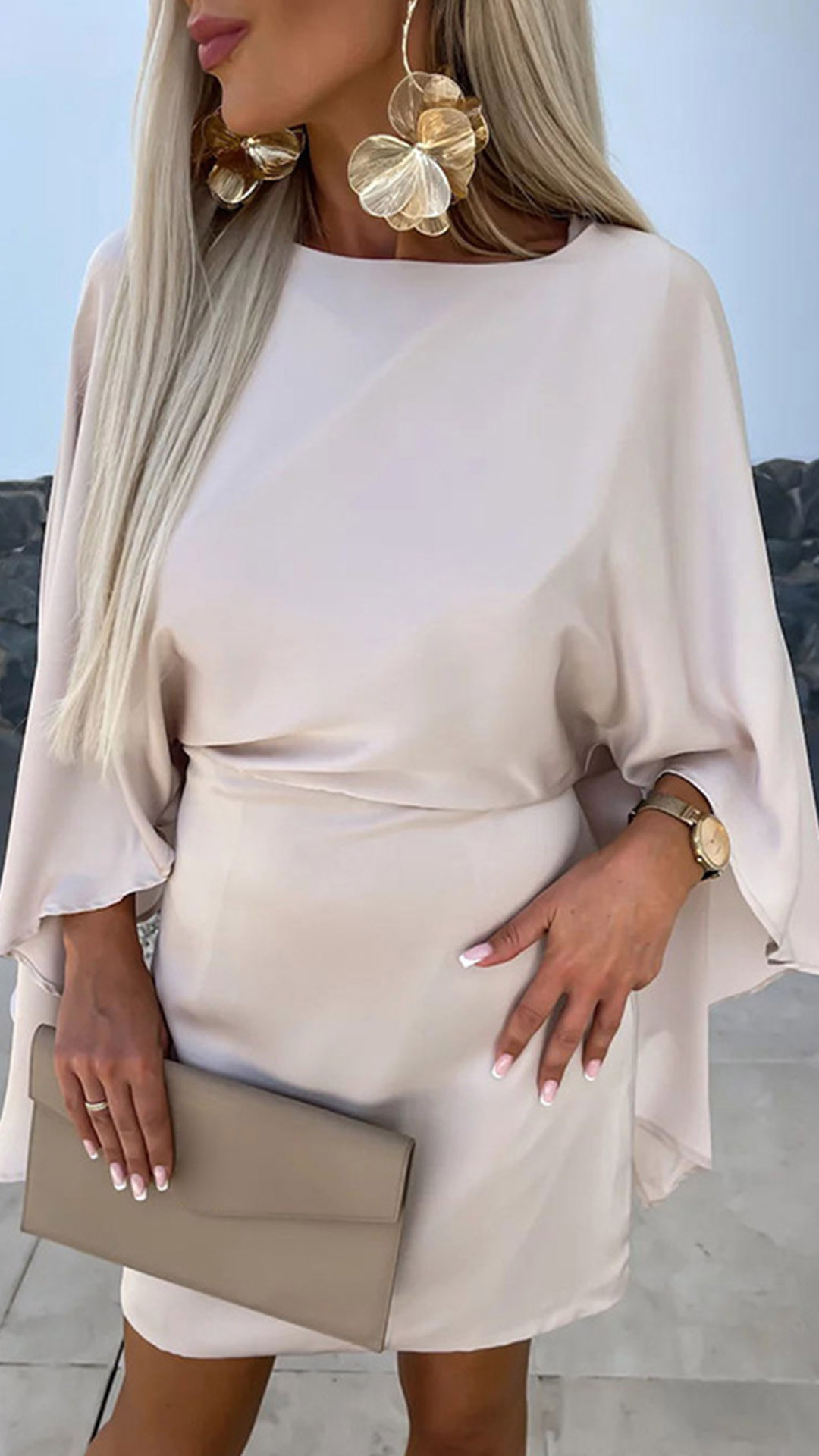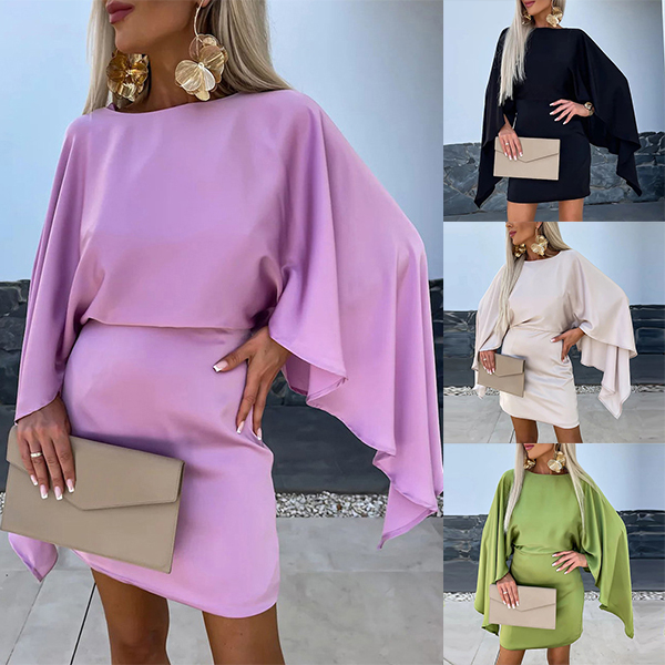 This is a chic and figure-flattering dress that combines a round neckline, batwing sleeves, and a bodycon silhouette for a stylish and versatile look.