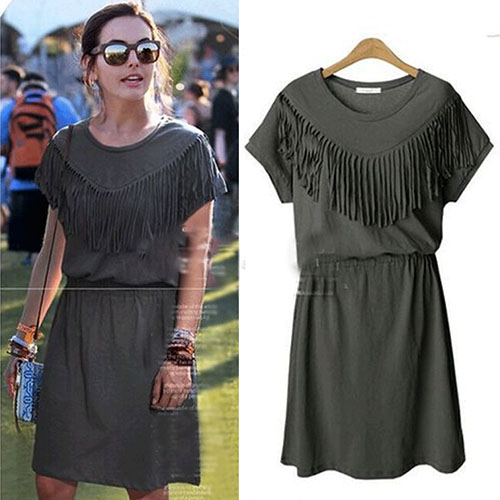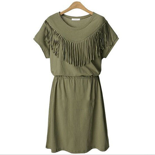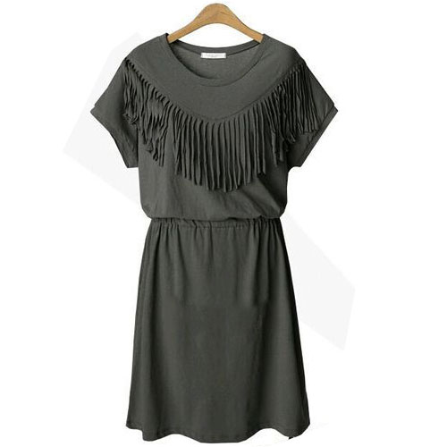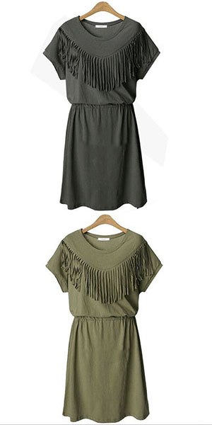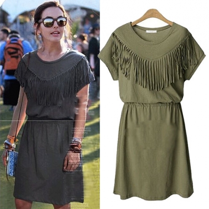 Fashion Solid Color Round-neck Gathered Waist Fringed Dress