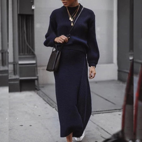 Fashion Solid Color Round Neck Knit Top + Irregular Slit Hem Skirt Two-piece Set