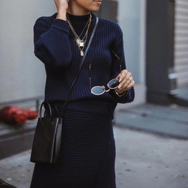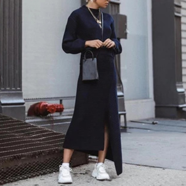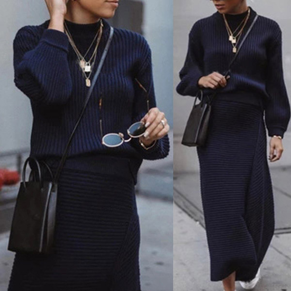 Solid color style,including a long sleeve round neck knit top and a high waist irregular slit hem skirt,this two-piece set is a good way to boost your charm and update your style. Dress it up with your favourite shoes and sweater necklace to achieve for a fashionable autumn look!