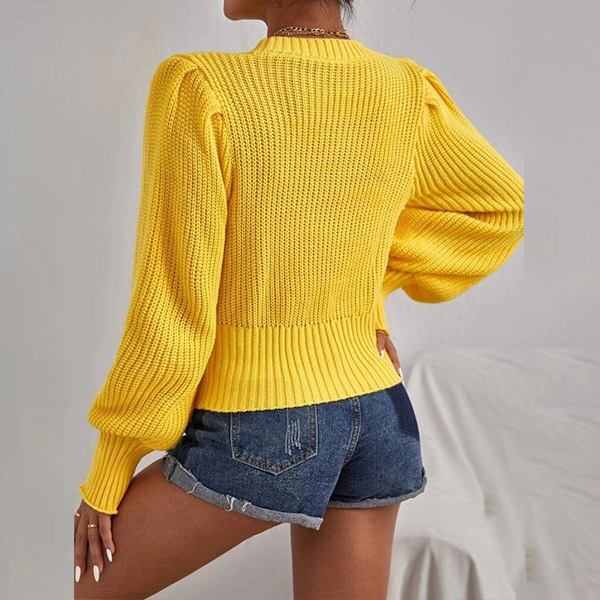 Introducing our new fashion pullover sweater! This sweater is perfect for any outfit. With a round neck and lantern sleeves, this sweater is both comfortable and stylish. The twist pullover design is unique and flattering, and the solid color is perfect for any occasion.