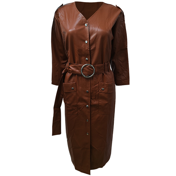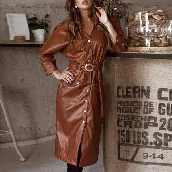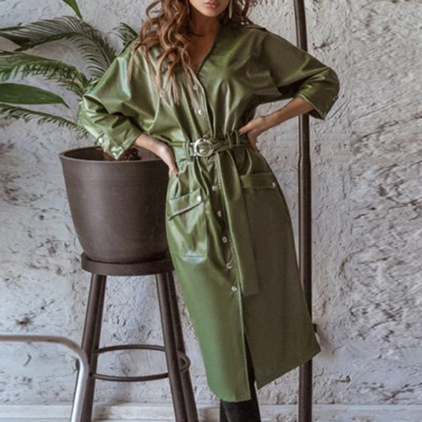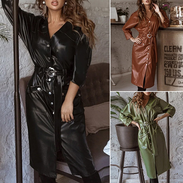 This chic and stylish dress is the perfect addition to any wardrobe. It is made from high-quality, artificial leather PU material. The dress features a round neckline, long sleeves, and a fit & flared silhouette. The waist is cinched with a stylish belt, and the dress is finished off with a solid color that will match any outfit.