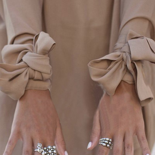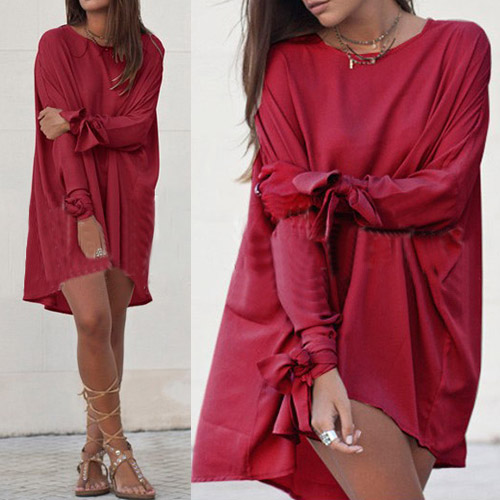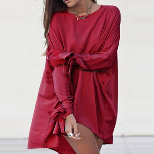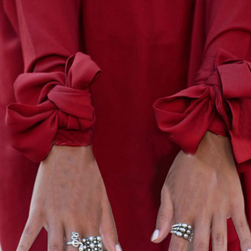 Cuff with bowknot design, chic and sweet. This solid-colored dress boasts round neck, long sleeve