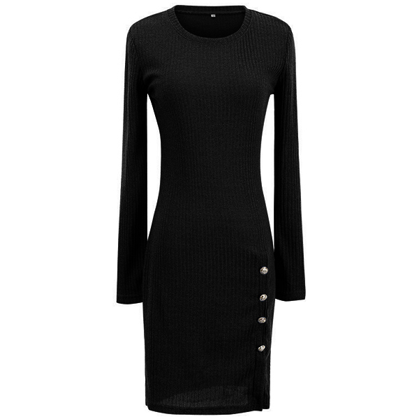 Fashion Solid Color Round Neck Long Sleeve Buttoned Slit Bodycon Dress