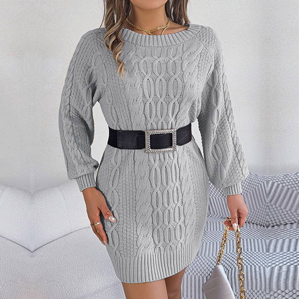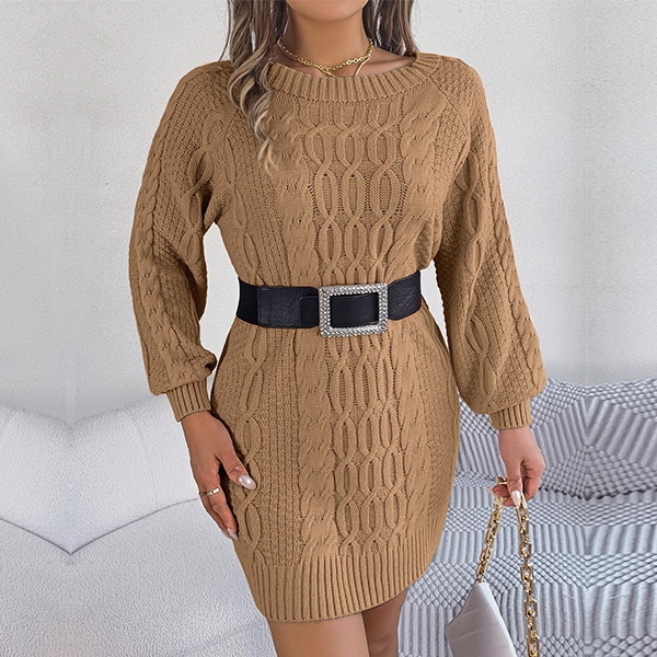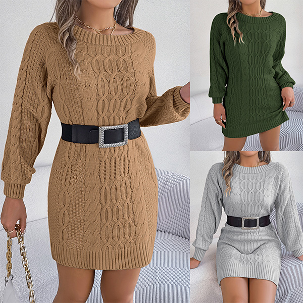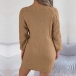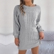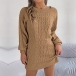 Fashion Solid Color Round Neck Long Sleeve Cable Knitting Sweater Dress