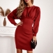 Fashion Solid Color Round Neck Long Sleeve Cinch Waist Dress