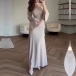 This stunning dress is a true showstopper that will turn heads wherever you go. With its solid color design, it exudes elegance and sophistication. The standout feature of this maxi dress is its criss-cross back tie detail, which creates a flattering cinched waist effect and adds a playful touch to the overall silhouette. Wanna have a try?
