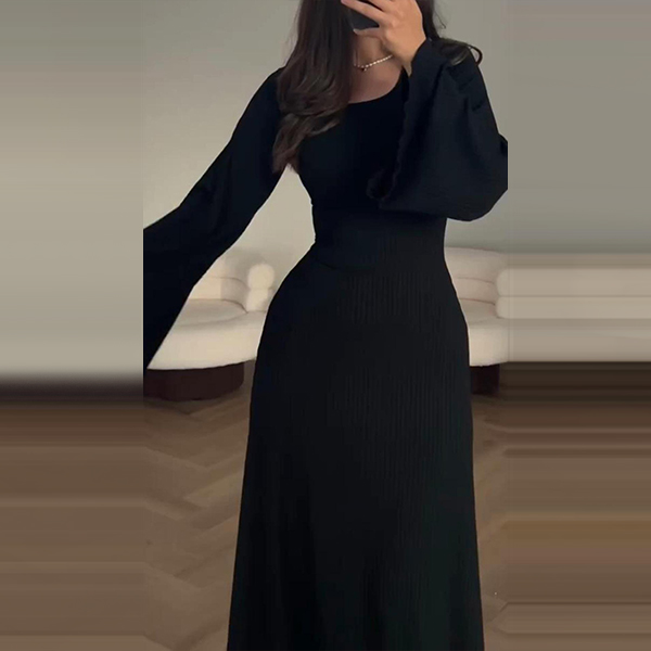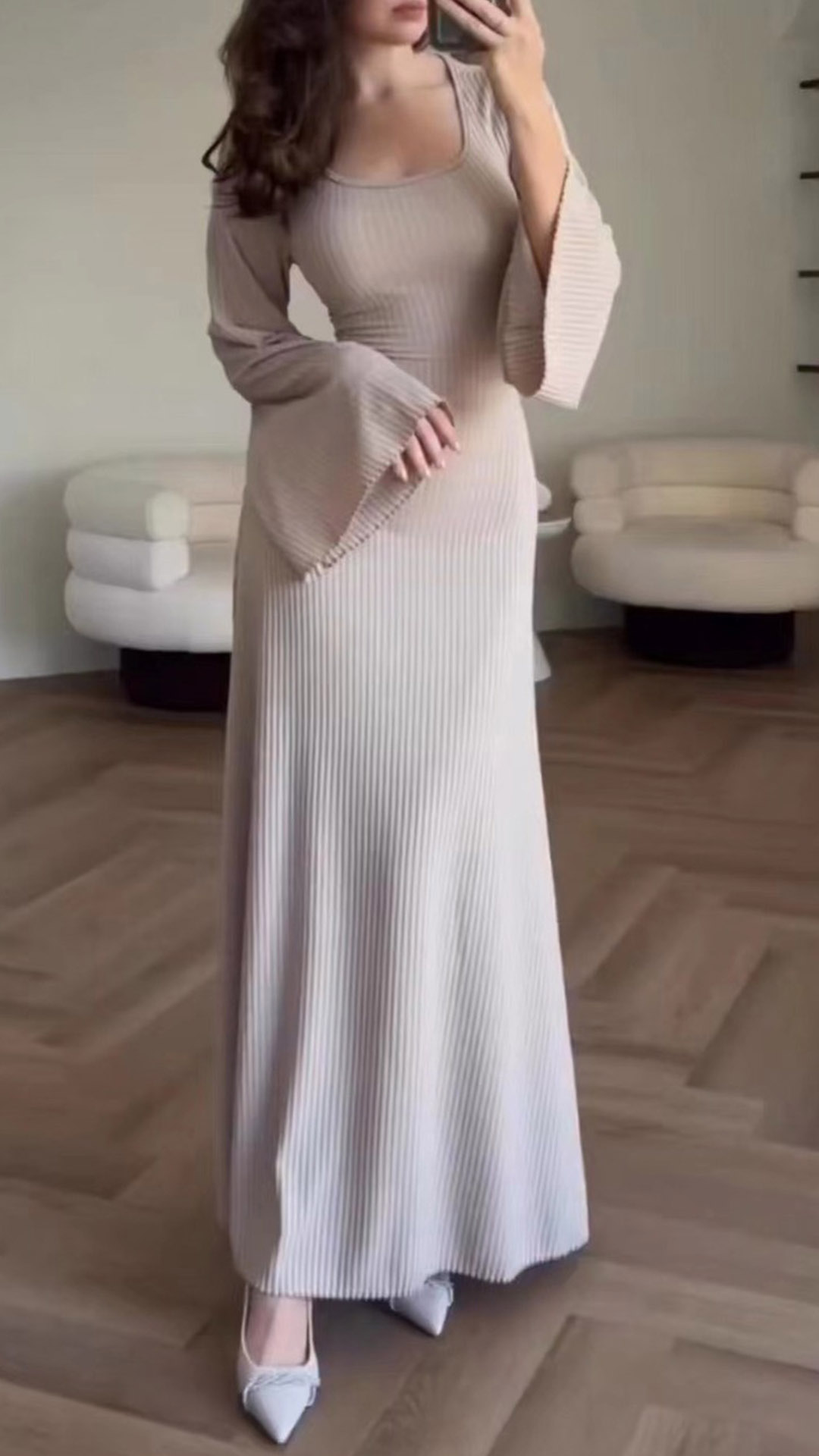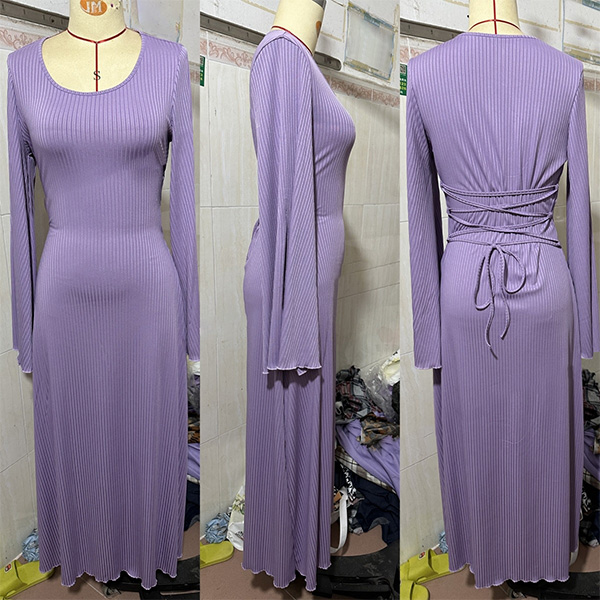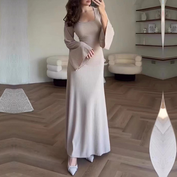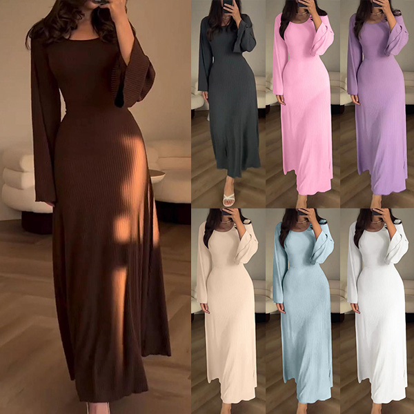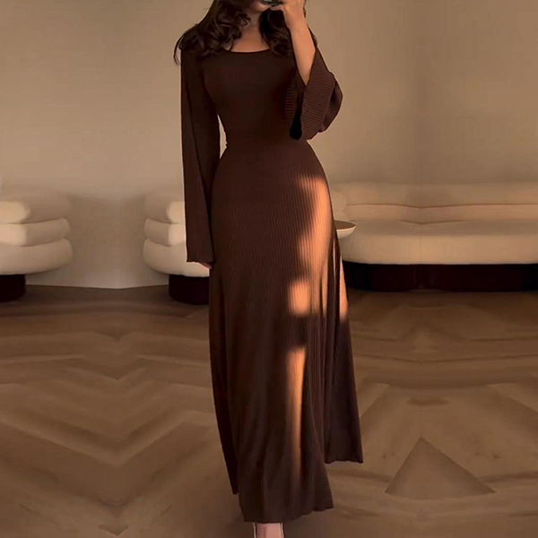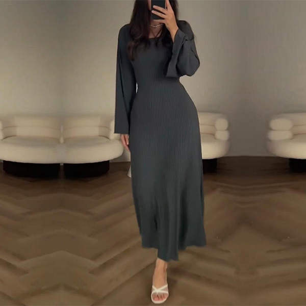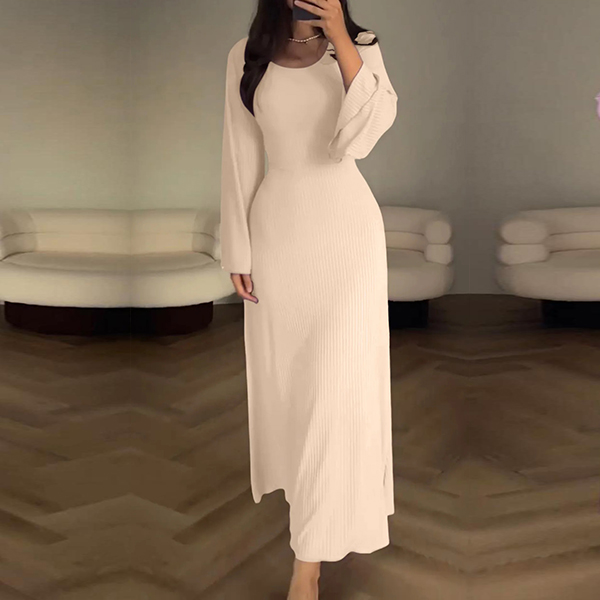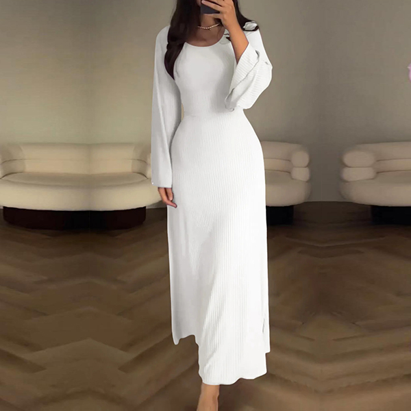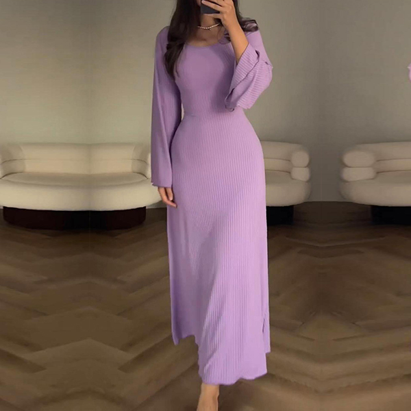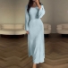 Fashion Solid Color Round Neck Long Sleeve Criss-cross Tie Ribbed Maxi Dress