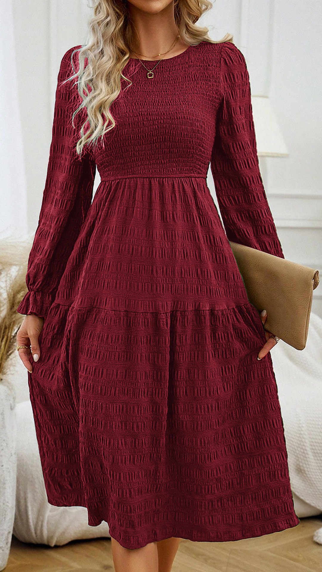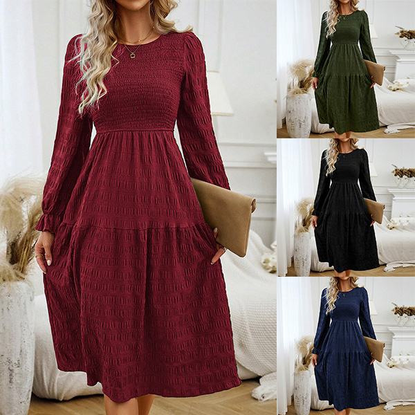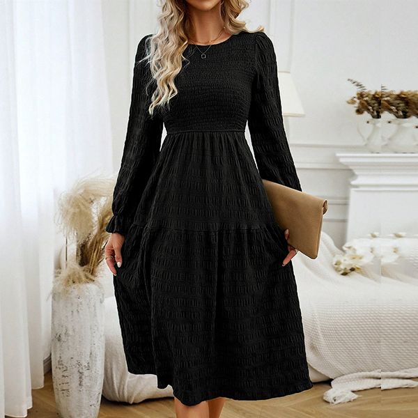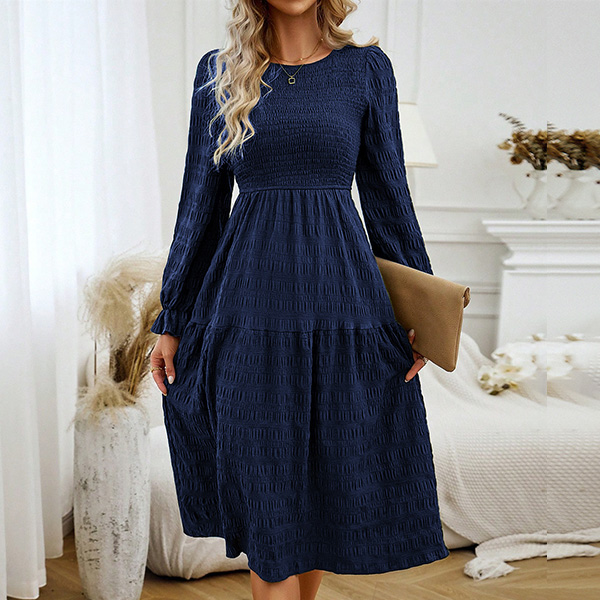 Fashion dress in solid color, round neck, long sleeve, smocked bidice and tiered design, make it your go-to option for any occasion and let your creativity shine through as you create various looks with this versatile and timeless piece.