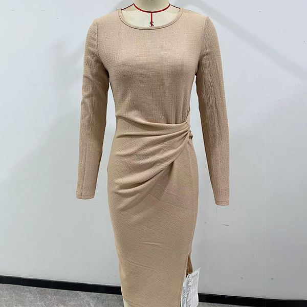 Fashion Solid Color Round Neck Long Sleeve Ruched Slit Bodycon Dress