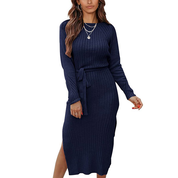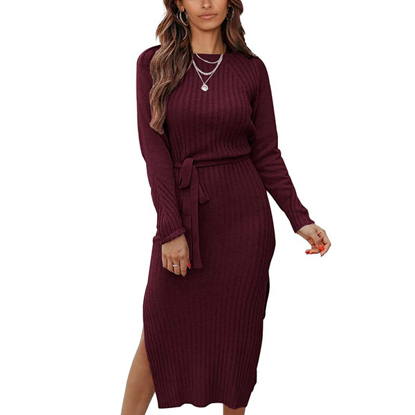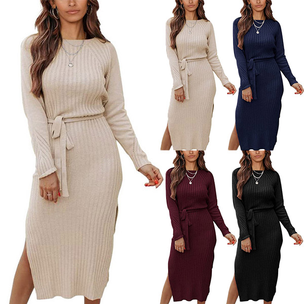 Fashion Solid Color Round Neck Long Sleeve Self-tie Slit Bodycon Ribbed Dress