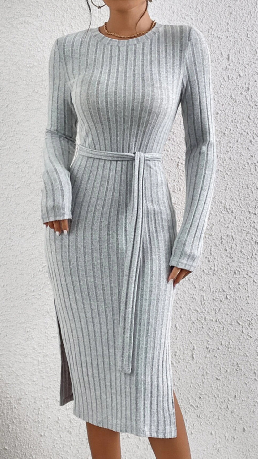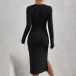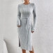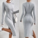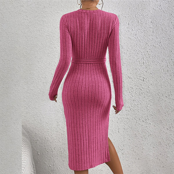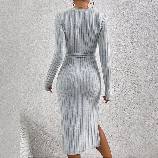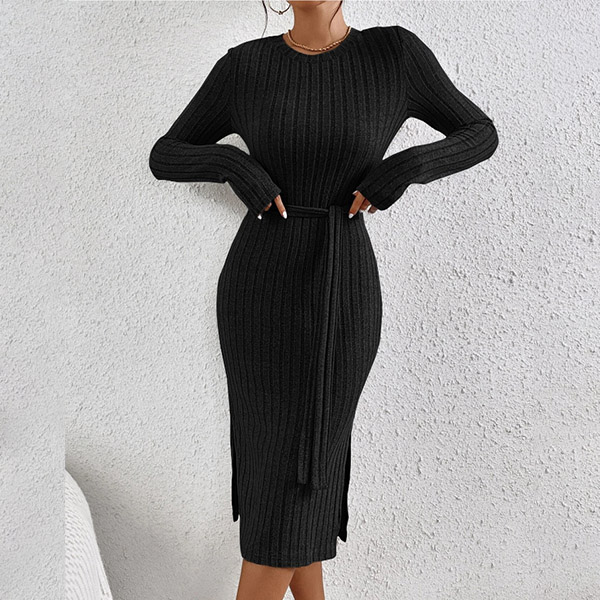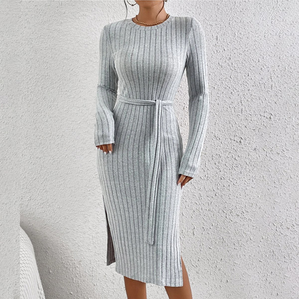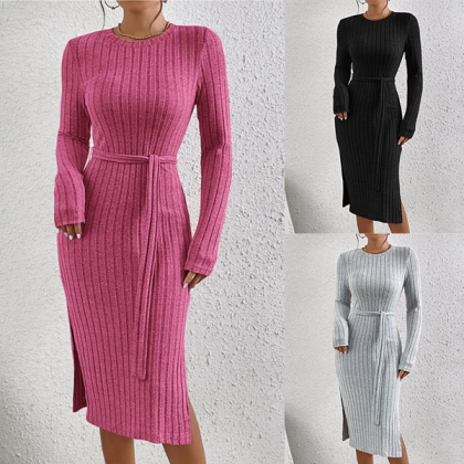 Fashion Solid Color Round Neck Long Sleeve Self-tie Slit Ribbed Dress