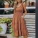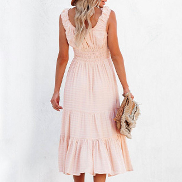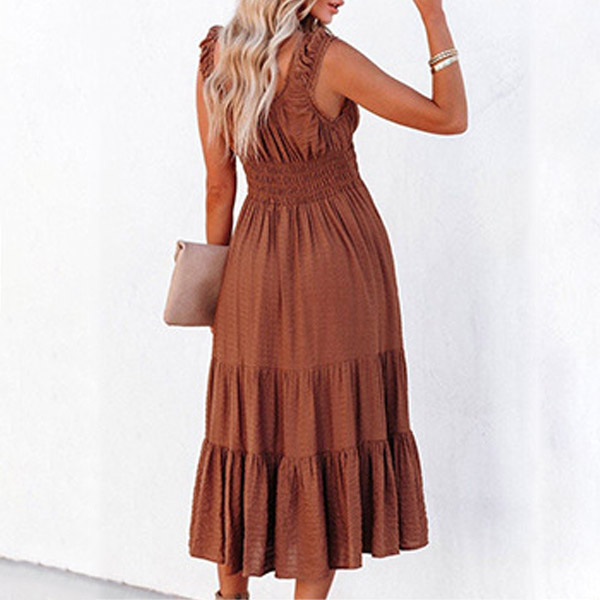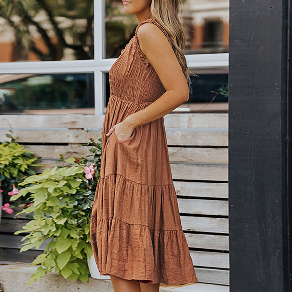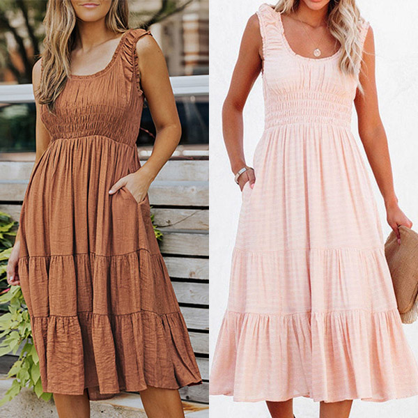 This dress features a high waist design that accentuates your curves and creates a flattering silhouette. The ruffled sleeveless add a touch of femininity, while the tiered skirt adds volume and movement to the dress. The side pockets are a practical and convenient feature that adds a modern touch to the dress. Wanna have a try?