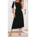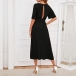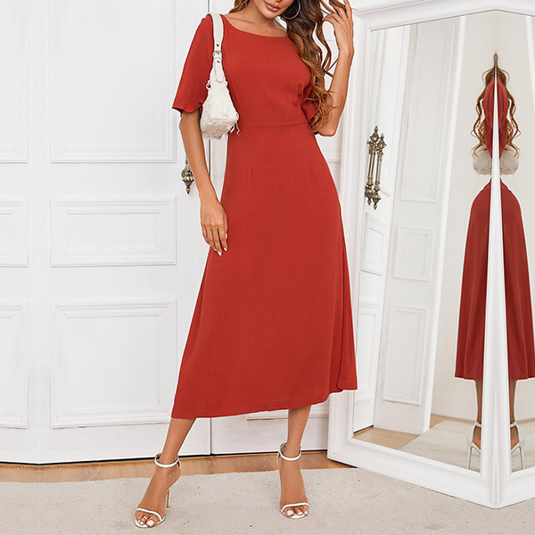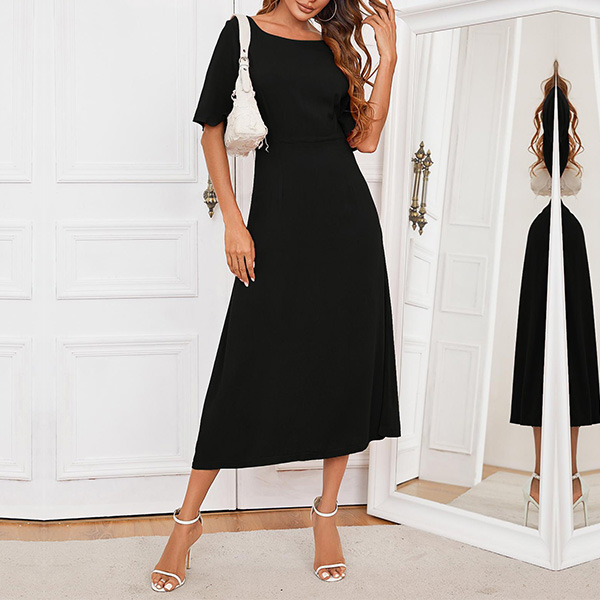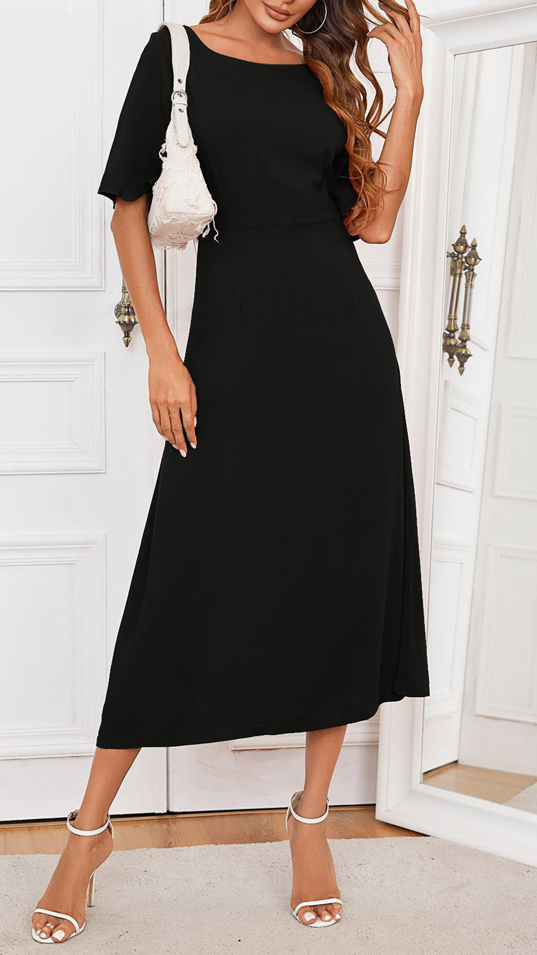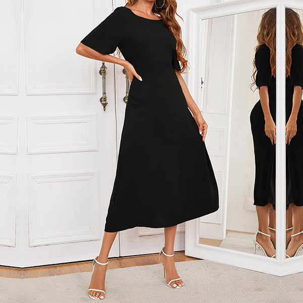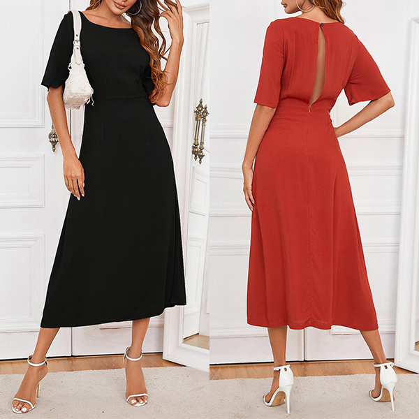 This dress features a classic round neckline and short sleeves, making it both elegant and comfortable to wear. The backless design adds a touch of sexiness to the dress, while the solid color design is timeless and can be dressed up or down depending on the occasion.