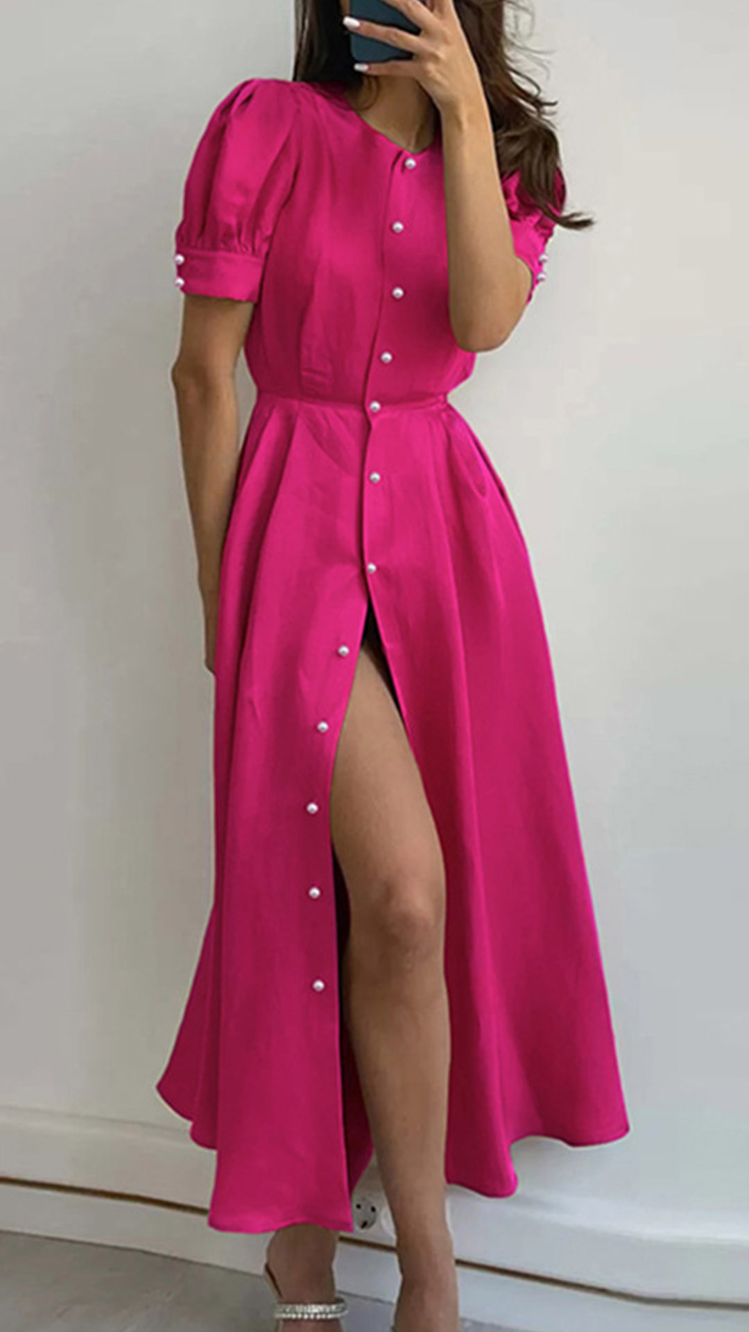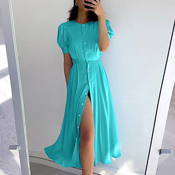 Fashion Solid Color Round Neck Short Sleeve Buttoned Slit Midi Dress