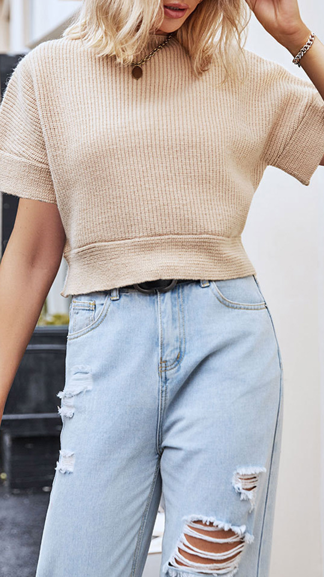 This sweater features a round neckline and short sleeves, giving it a modern and stylish look. The crop length adds a fashionable twist and allows for easy pairing with high-waisted bottoms like skirts, jeans, or shorts. Wanna have a try?